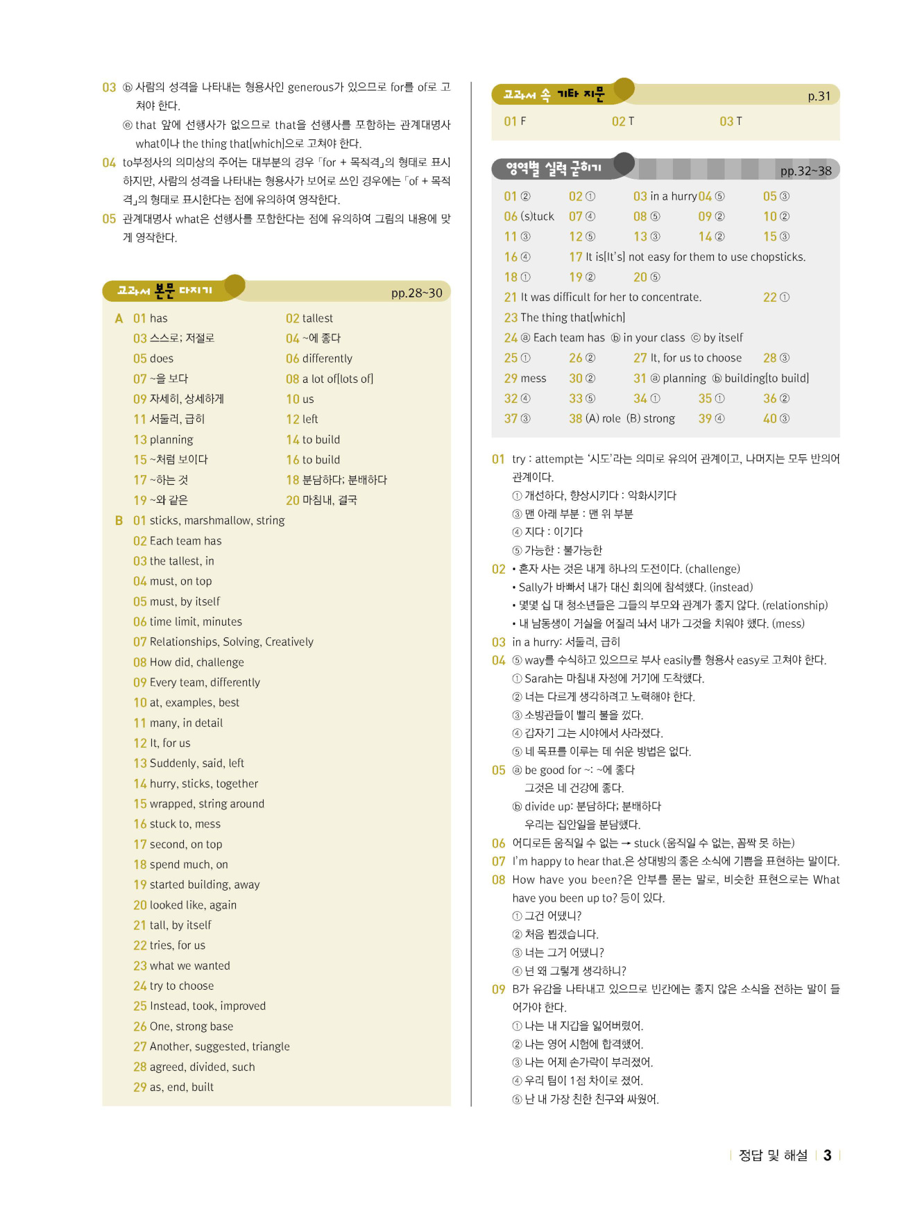 끊어 읽기와 구문 분석, 단답형 문제, 빈칸 완성 문제를 통해 교과서 본문을 확실하게 학습할 수 있게 하고, 교과서 내 기타 지문들을 모두 수록하여 점검할 수 있도록 함