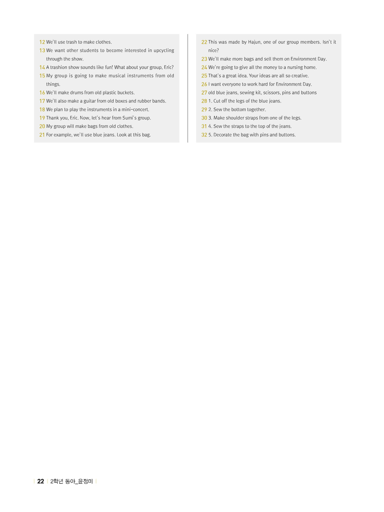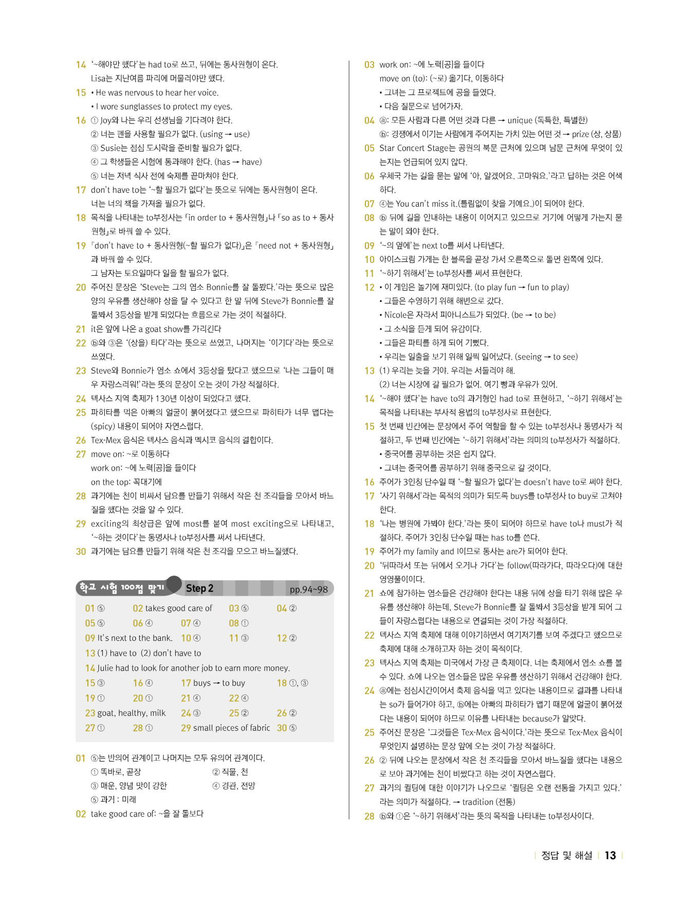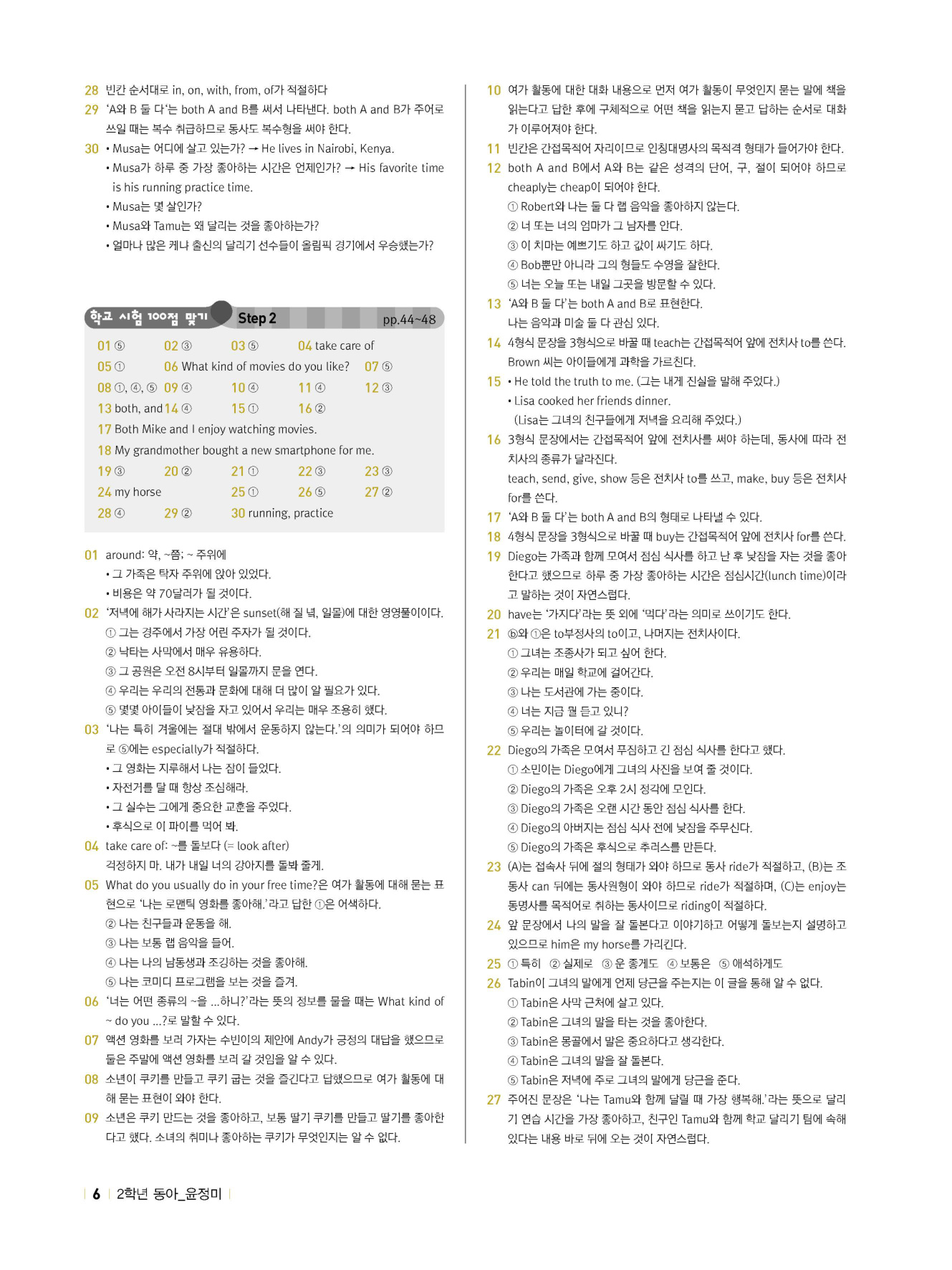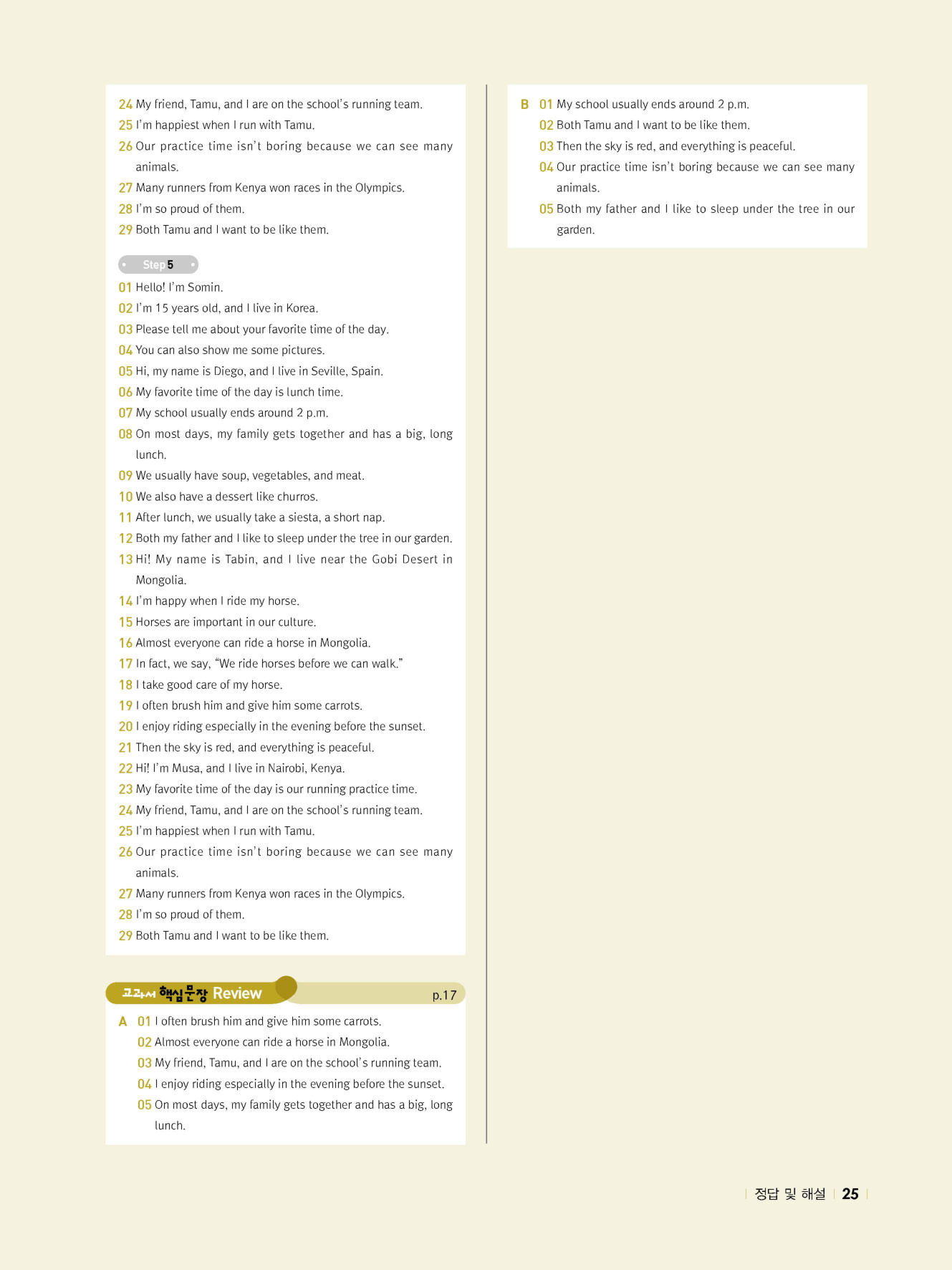 - 교과서 어휘 및 표현, 대화 2단계, 본문 5단계의 단계별 쓰기 강화 훈련 수록