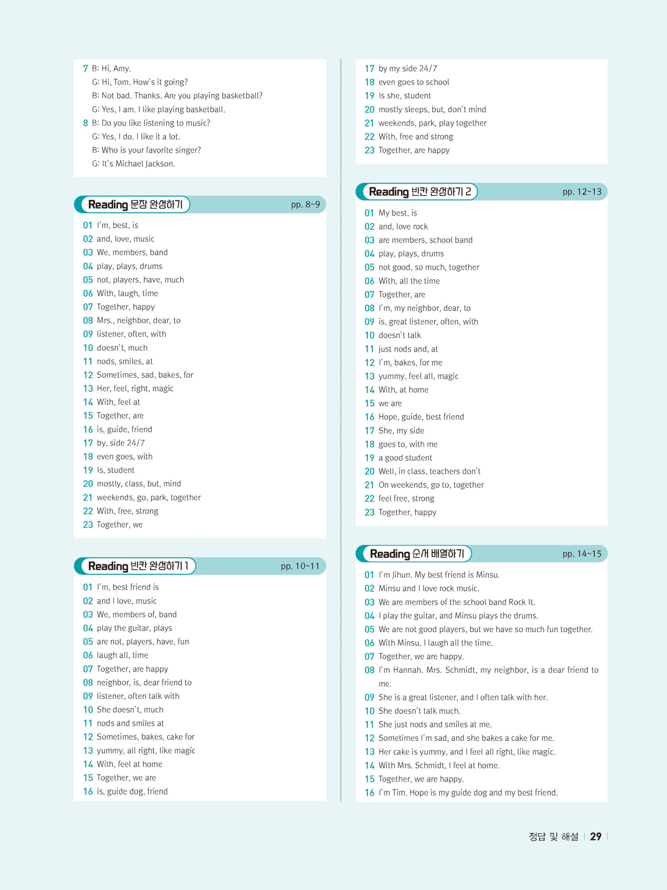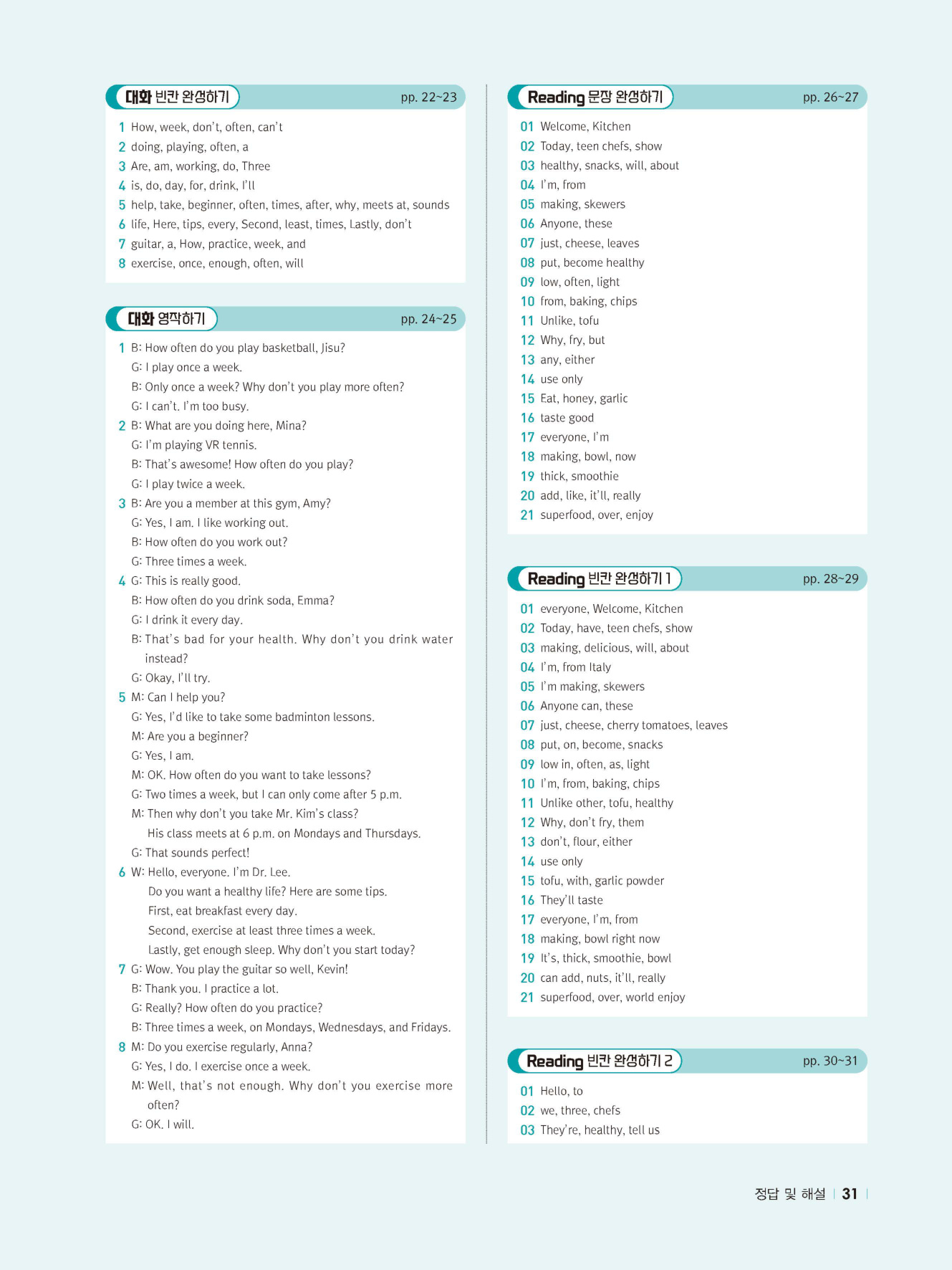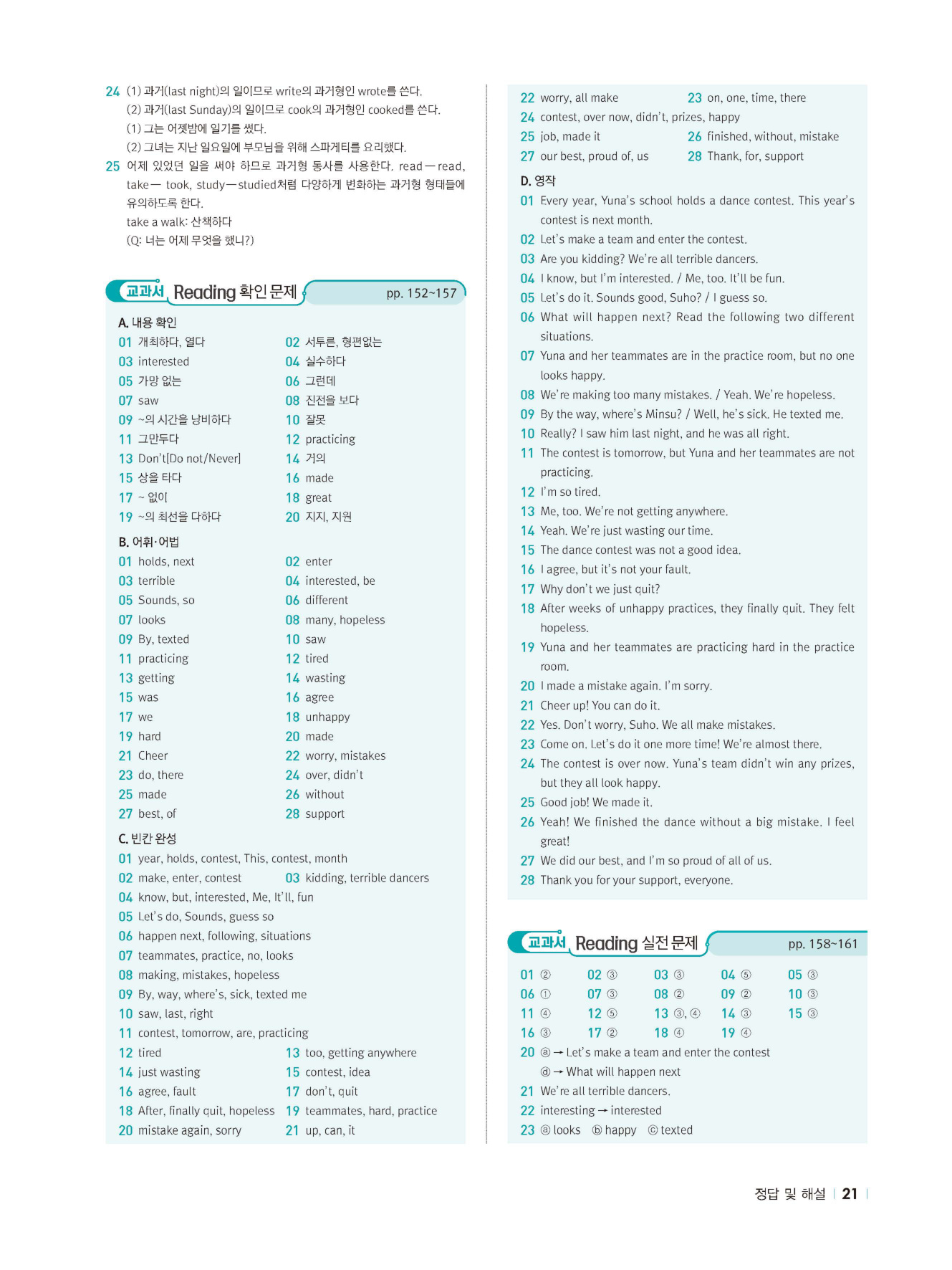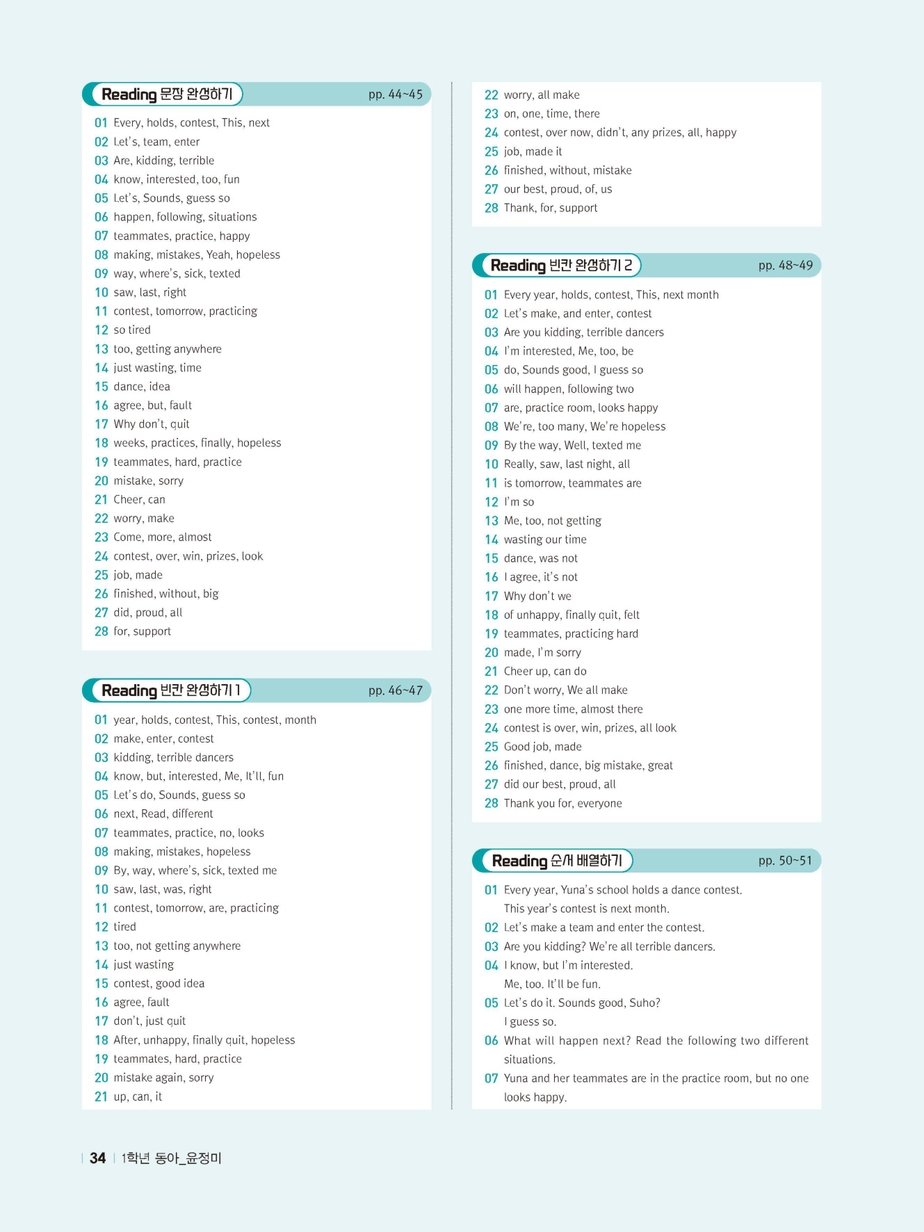 - 교과서 어휘 및 표현, 대화 2단계, Reading 5단계의 단계별 쓰기 강화 훈련 수록