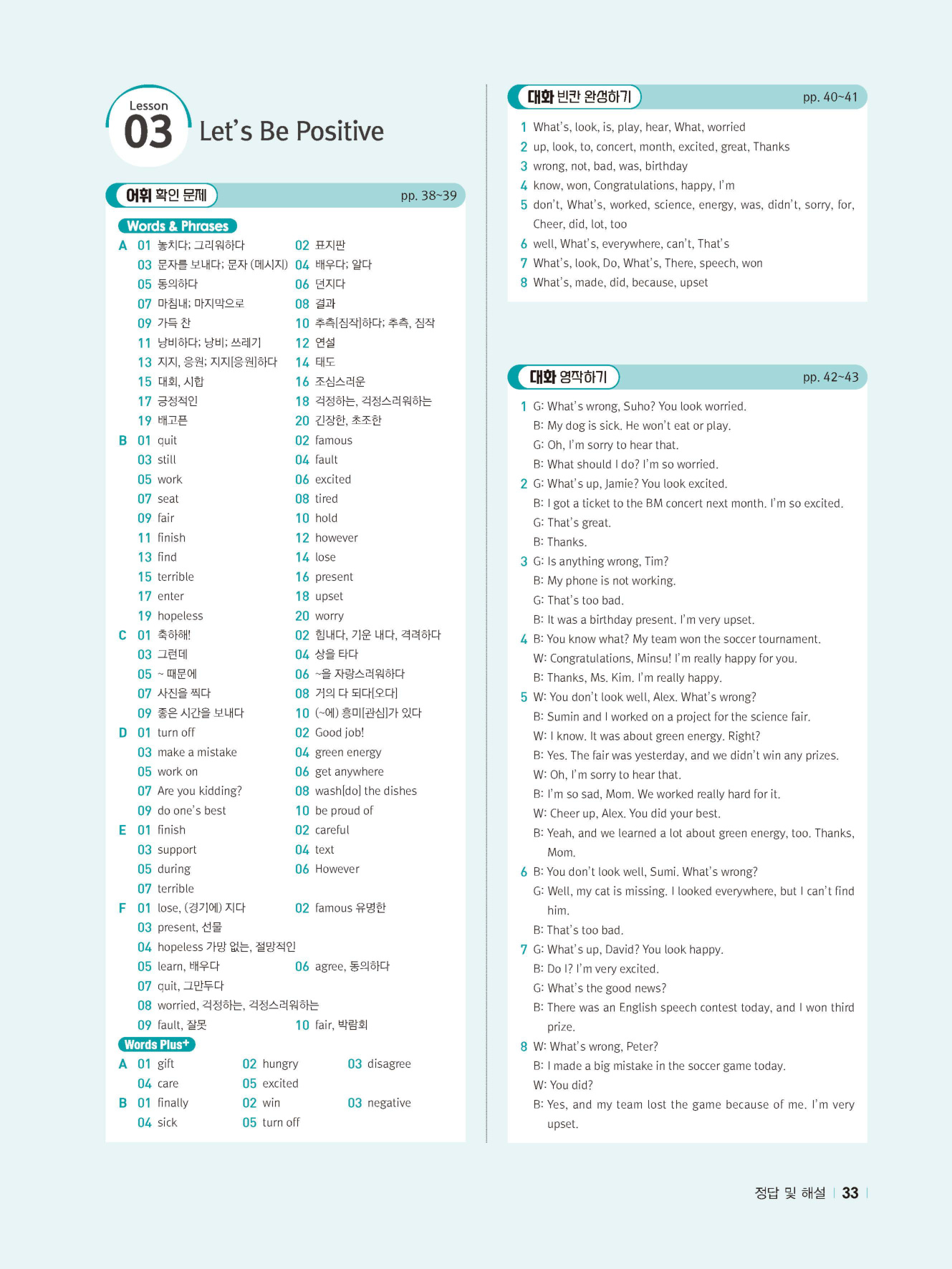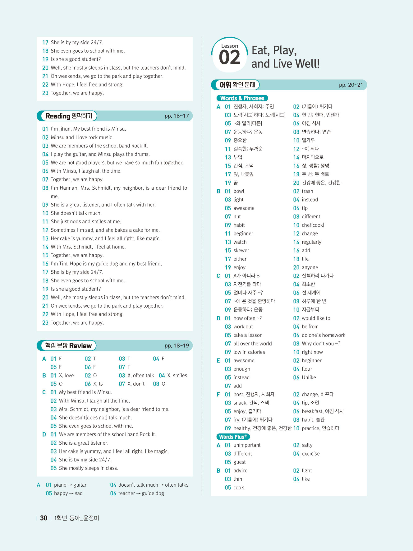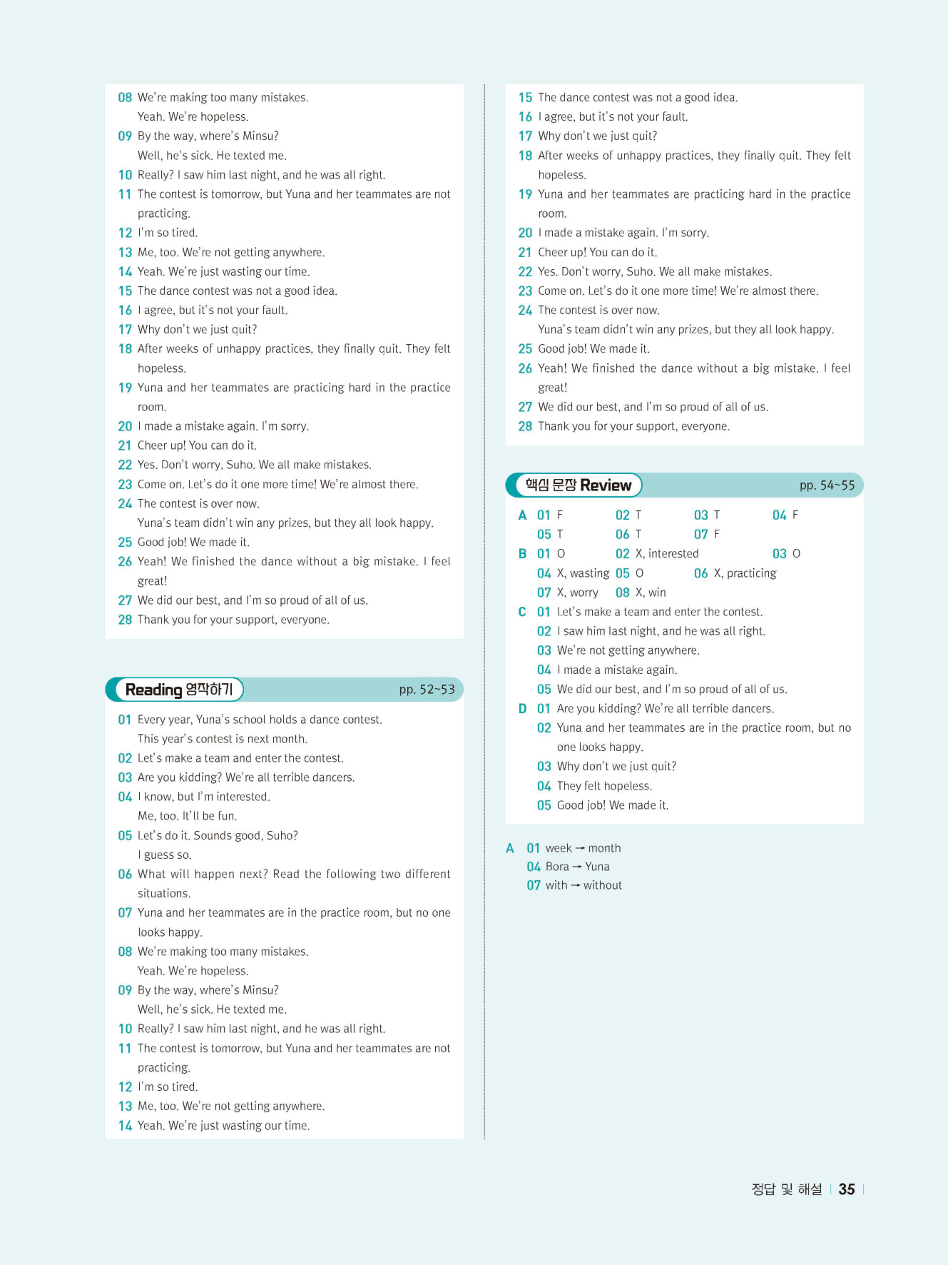- 교과서 어휘 및 표현, 대화 2단계, Reading 5단계의 단계별 쓰기 강화 훈련 수록