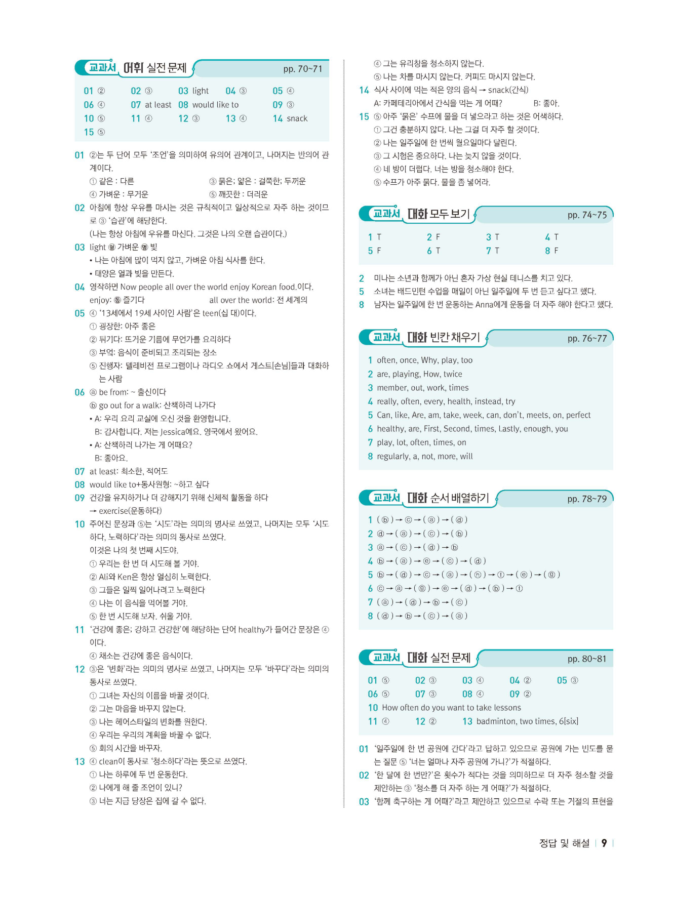 어휘, 대화, 문법, 독해의 영역별로 서술형 문제를 포함한 다양한 문제들을 풀어봄으로써 문제 풀이 실력 쌓고 학교 시험에 적응