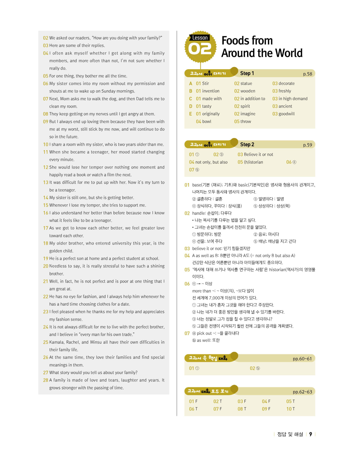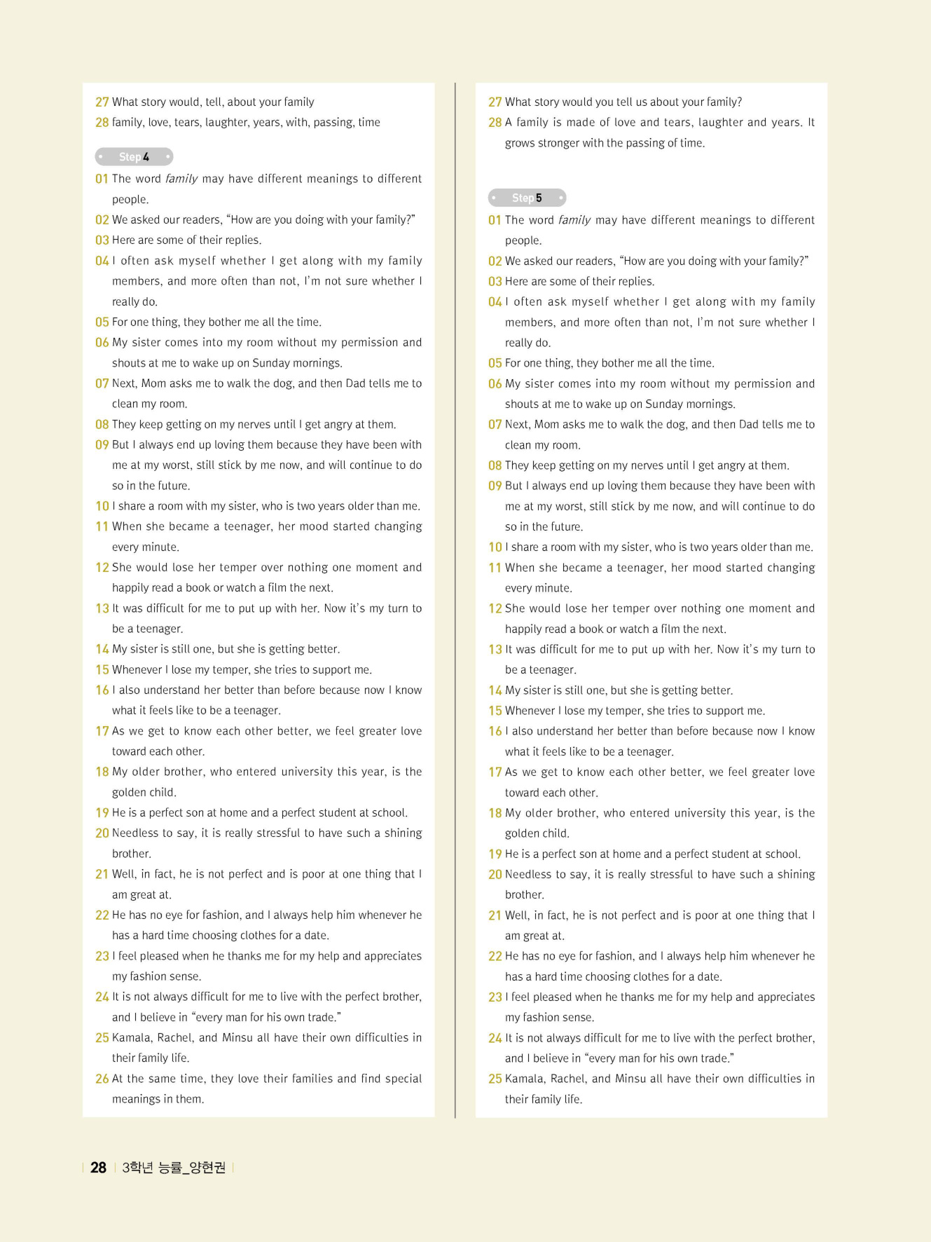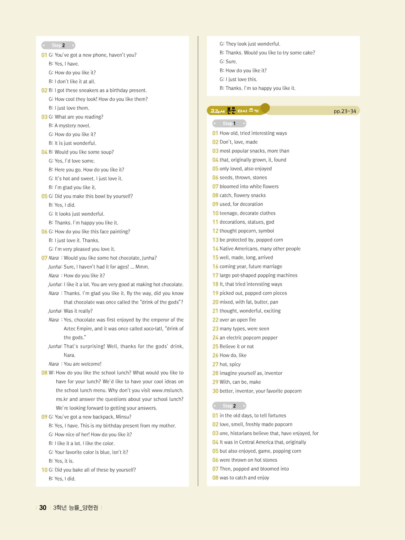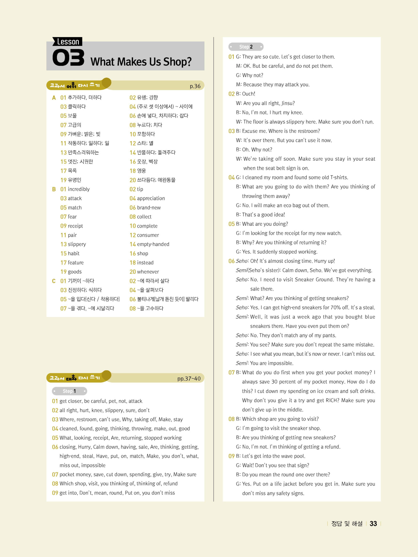 - 교과서 어휘 및 표현, 대화 2단계, 본문 5단계의 단계별 쓰기 강화 훈련 수록