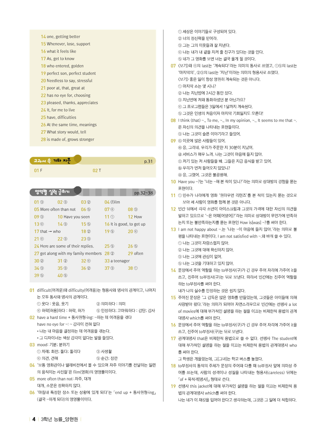 어휘, 대화, 문법, 독해의 각 영역별로 서술형 및 논술형 문제를 포함한 다양한 문제들을 풀어봄으로써 학교시험에 적응 할 수 있도록 함