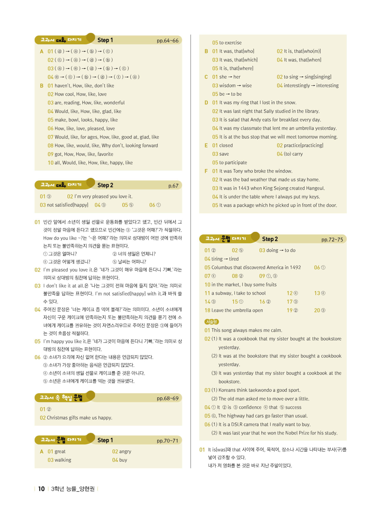 2. 교과서 속 핵심 대화 / 교과서 대화 모두 보기 / 교과서 대화 다지기 Step 1, 2교과서 핵심 의사소통 및 단원 내 모든 대화문의 꼼꼼한 분석과 함께 단계별 확인 학습 문제를 제시함으로써의사소통 기능을 완벽히 다질 수 있도록 함