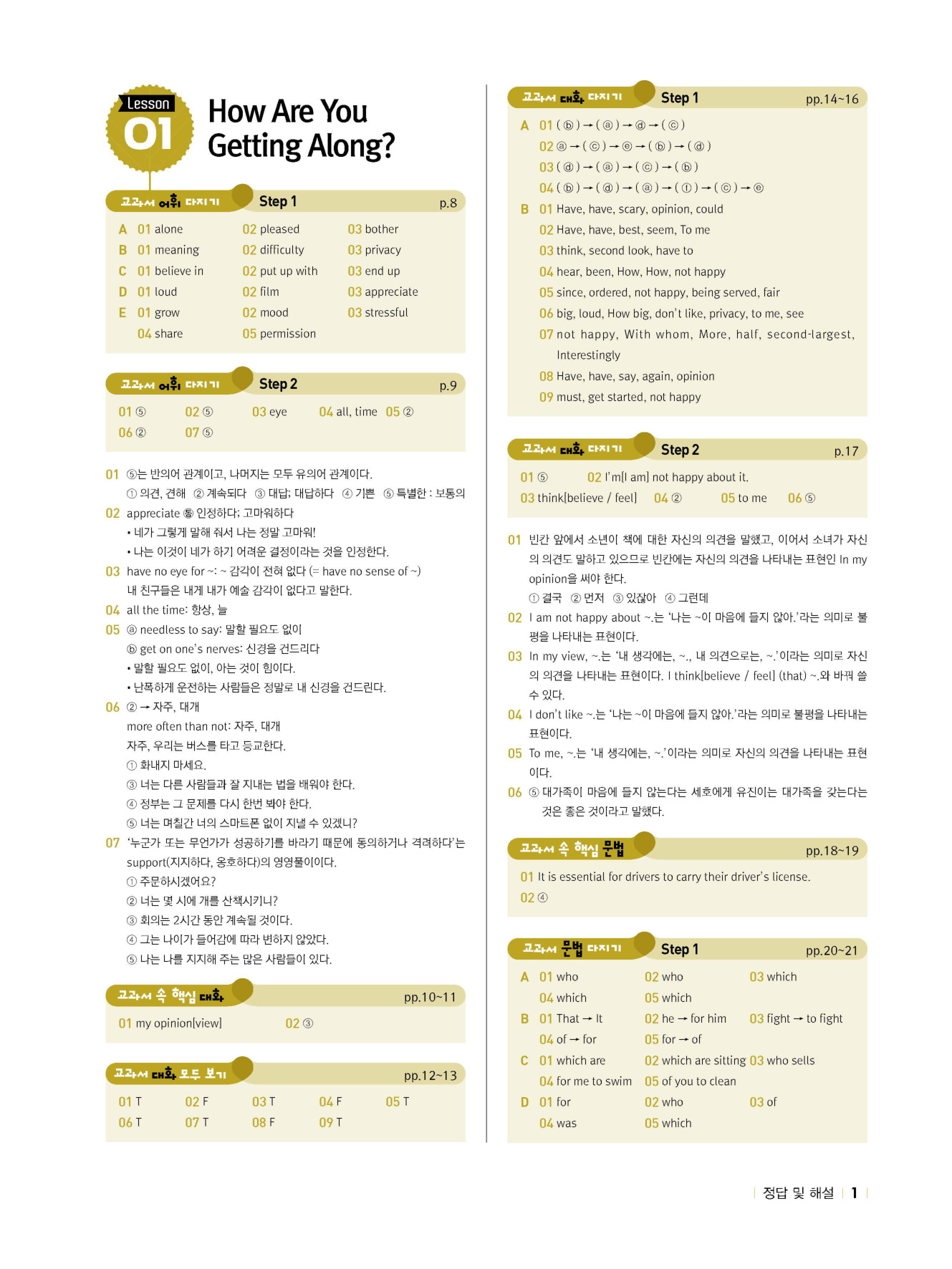 끊어 읽기와 구문 분석, 단답형 문제, 빈칸 완성 문제를 통해 교과서 본문을 확실하게 학습할 수 있게 하고, 교과서 내 기타 지문들을 모두 수록하여 점검할 수 있도록 함