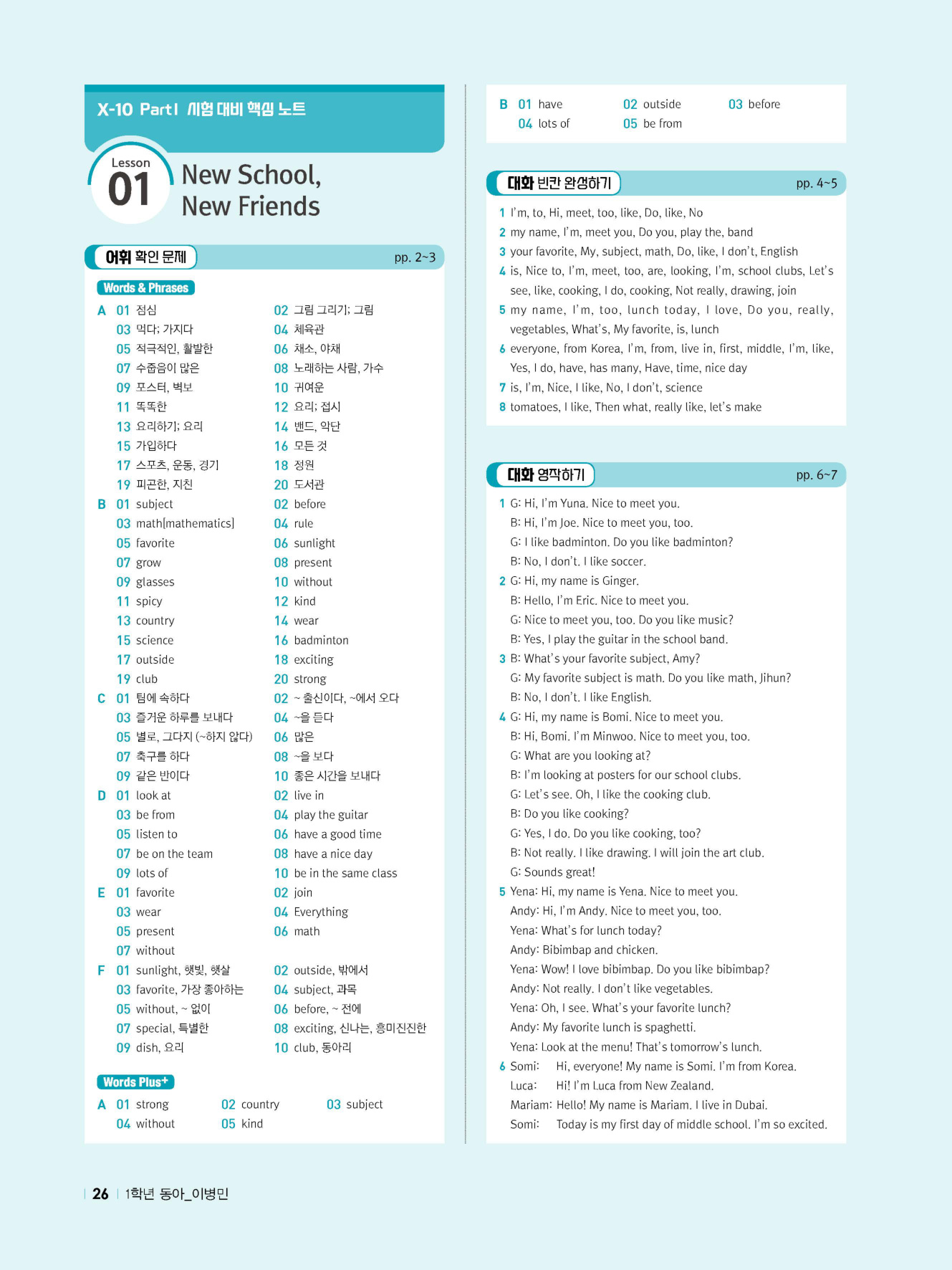 - 어휘·대화·독해 영역을 반복 암기 학습하고, 출제 가능성 높은 교과서 핵심 문장을 복습할 수 있음