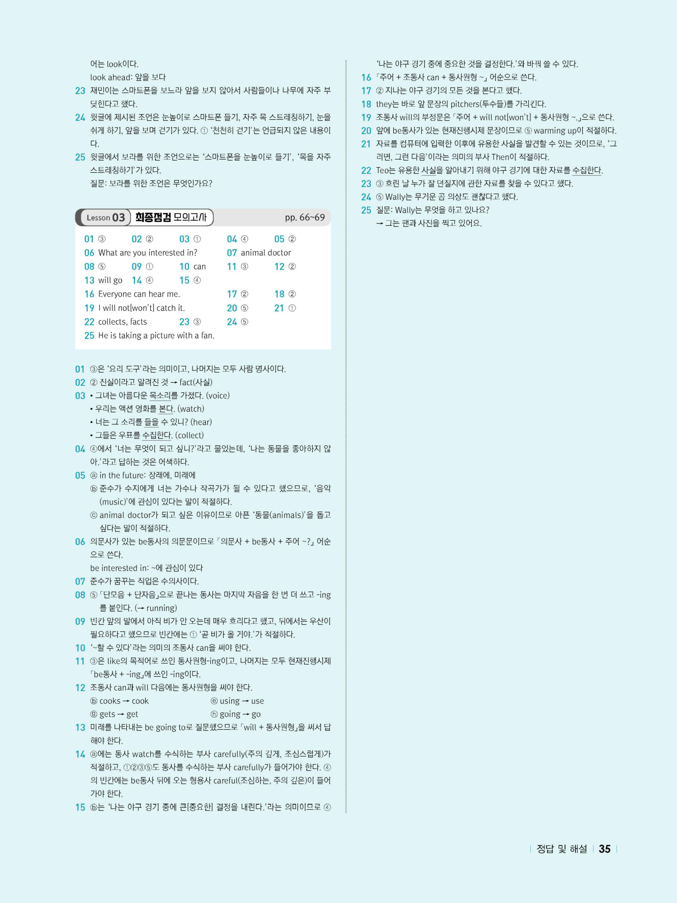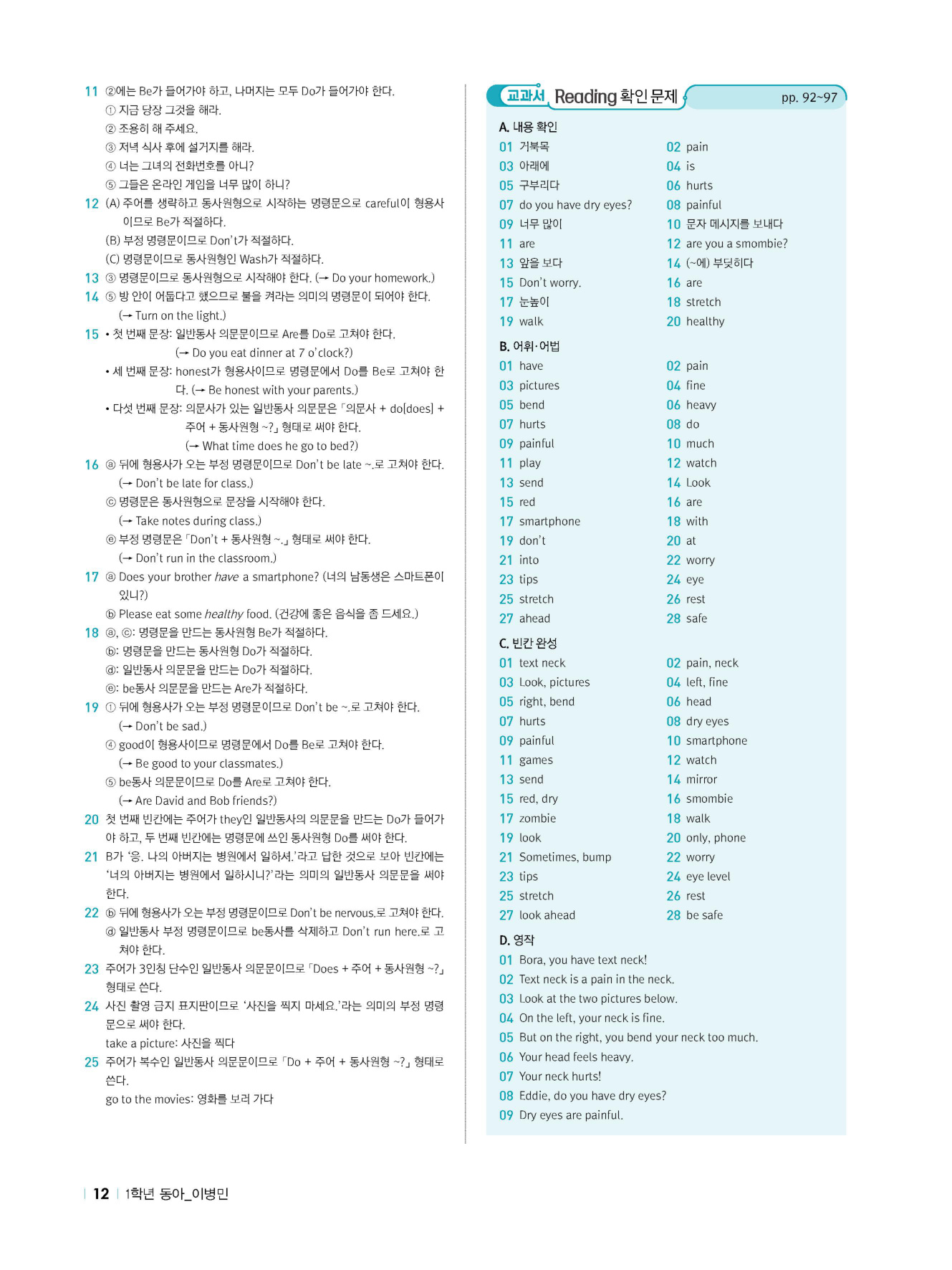교과서 핵심 어휘 학습, 영영풀이와 유의어·반의어·접미사 등 심화 학습 후, 확인 문제를 통해 교과서 주요 어휘와 표현을 암기. 학교 시험에 출제된 다양한 유형의 어휘 문제를 실전·심화 단계별로 풀어봄으로써 실전에 완벽히 대비할 수 있도록 함