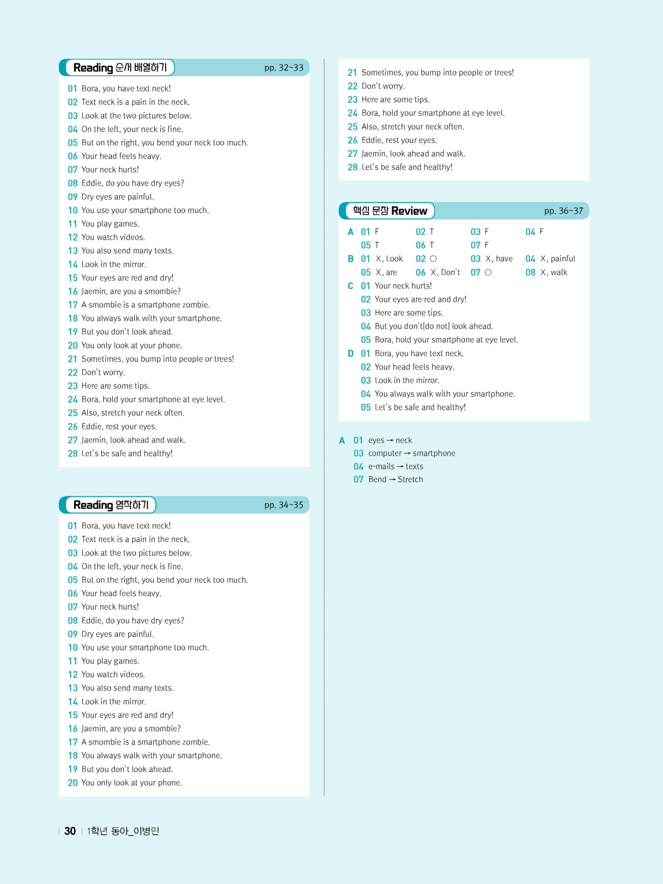 교과서 독해 본문을 끊어 읽기와 함께 심층 분석하고, 내용 확인하기/적절한 어휘·어법 고르기/순서 배열하기/영작하기를 통해 본문 주요 표현과 어법을 확인하고 문장 구성 및 작문 능력을 기를 수 있으며, 학교 시험에 출제된 다양한 유형의 읽기 문제를 실전·심화 단계별로 풀어봄으로써 실전에 완벽히 대비할 수 있도록 함