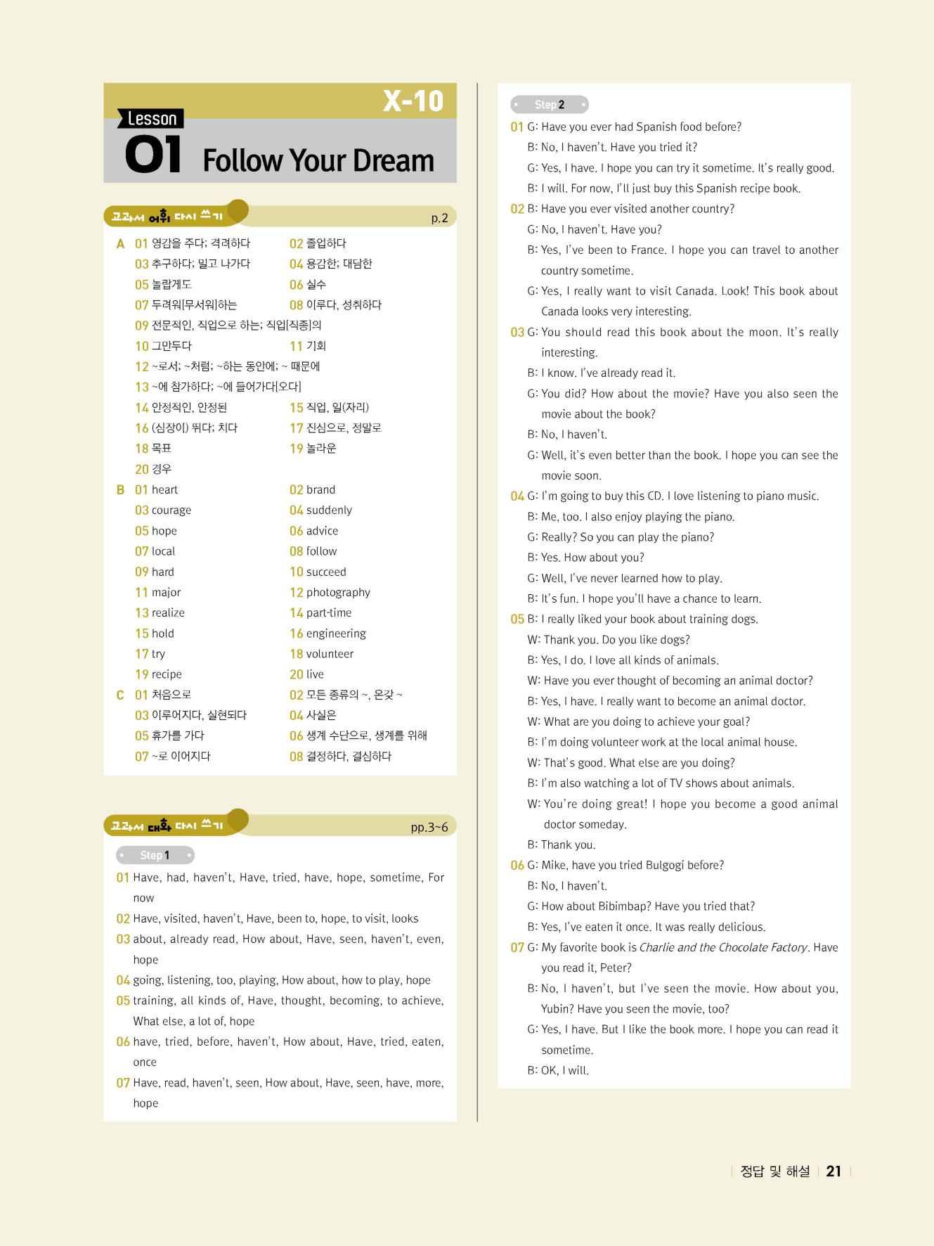 - 교과서 어휘 및 표현, 대화 2단계, 본문 5단계의 단계별 쓰기 강화 훈련 수록