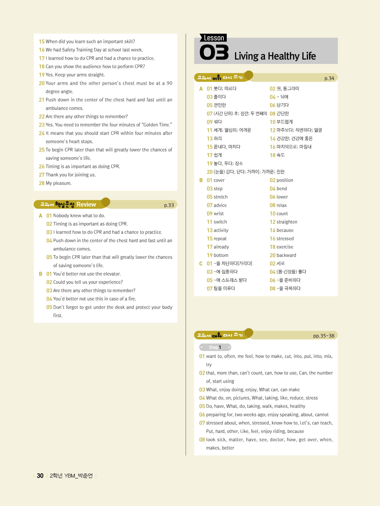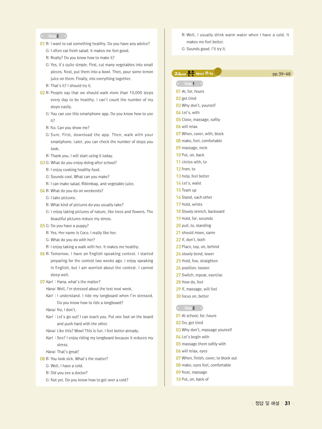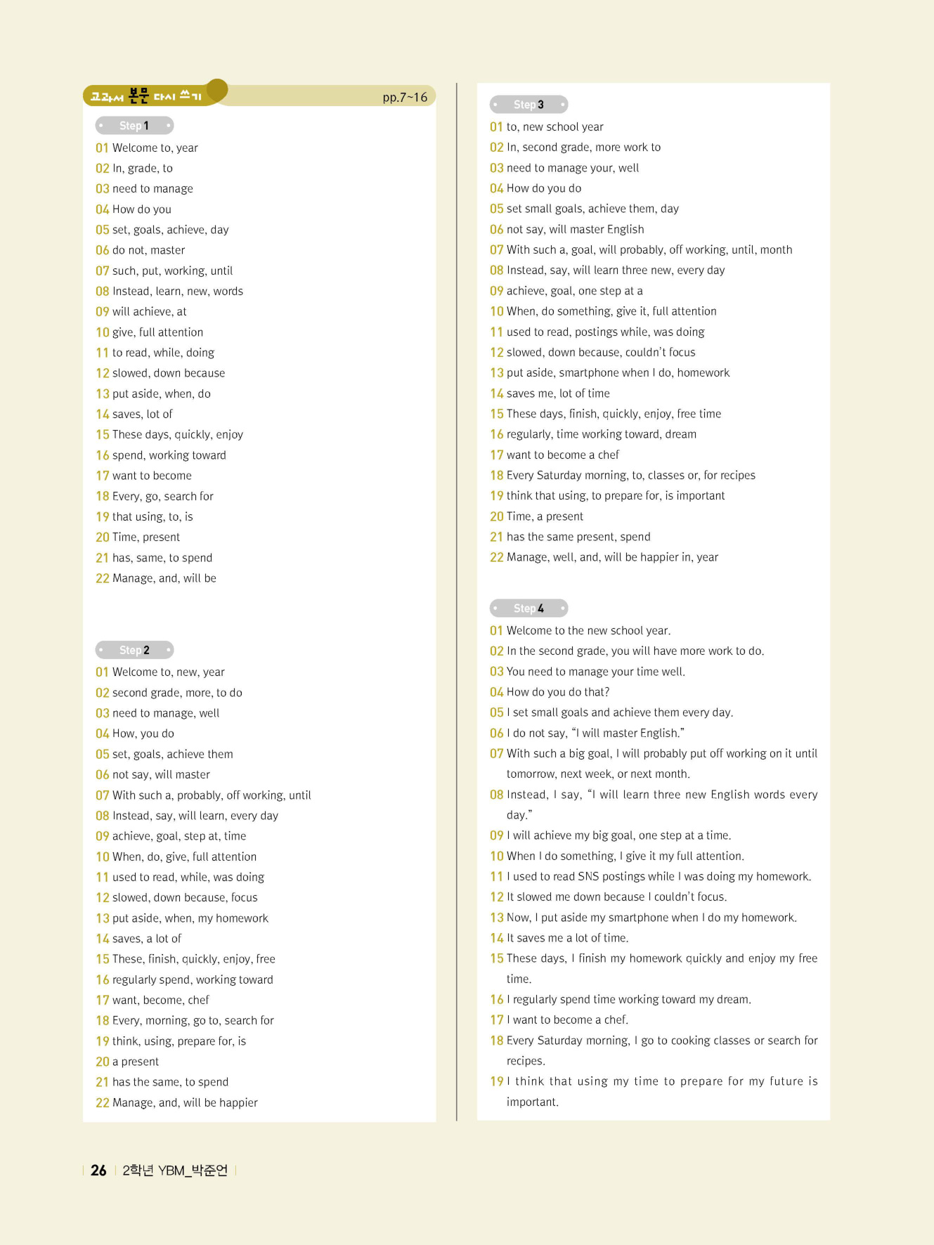 - 교과서 어휘 및 표현, 대화 2단계, 본문 5단계의 단계별 쓰기 강화 훈련 수록