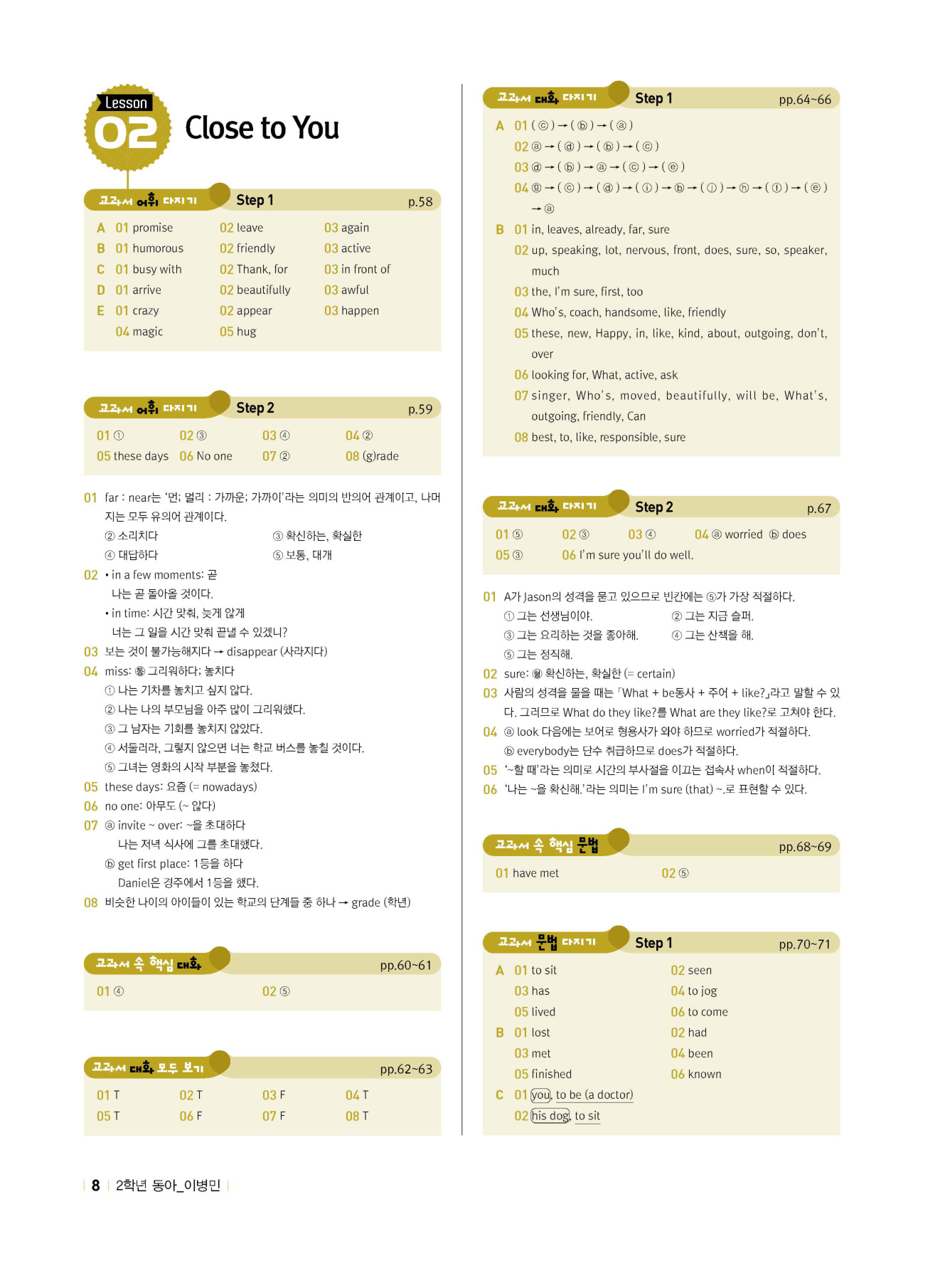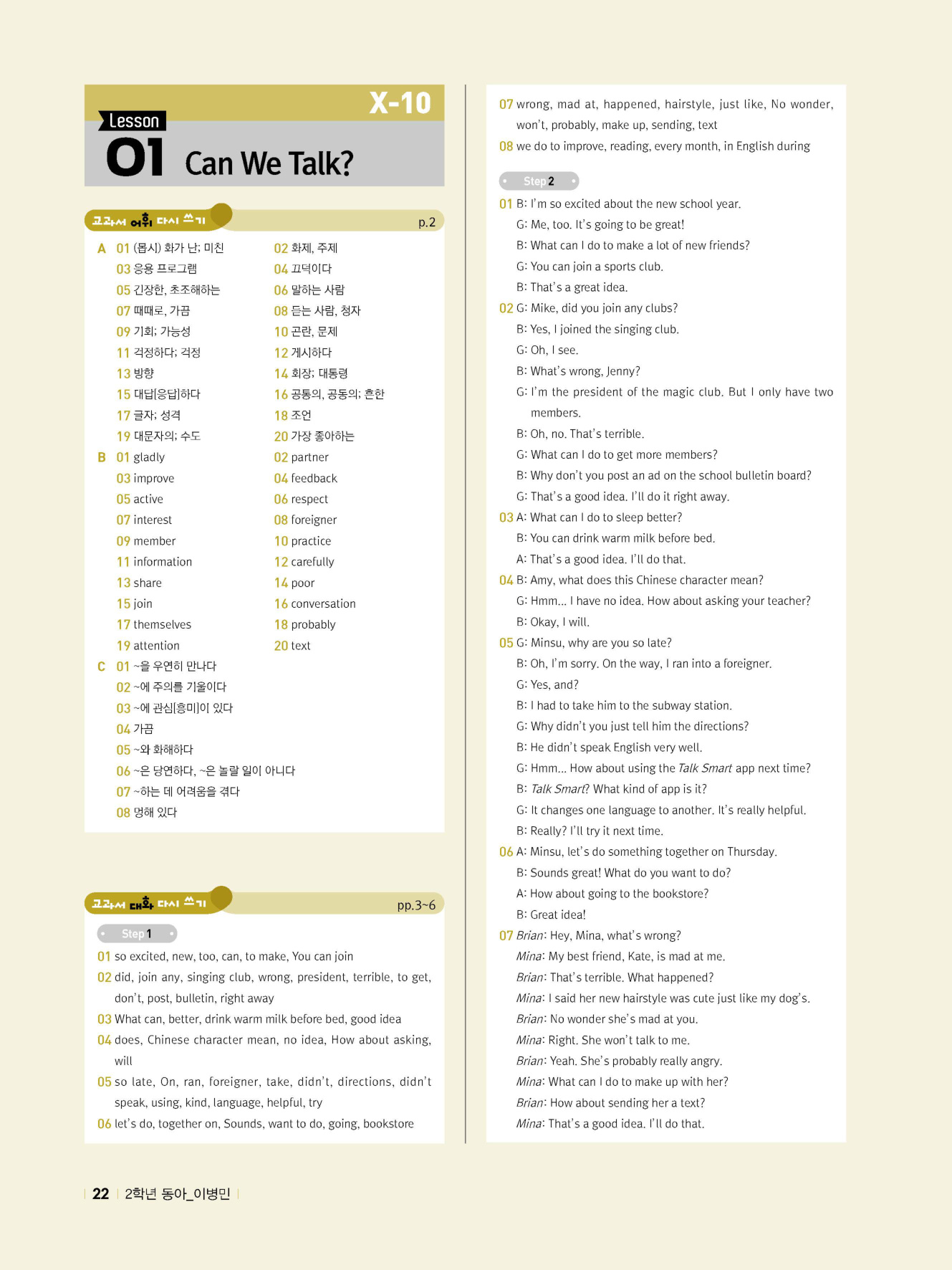 - 교과서 어휘 및 표현, 대화 2단계, 본문 5단계의 단계별 쓰기 강화 훈련 수록