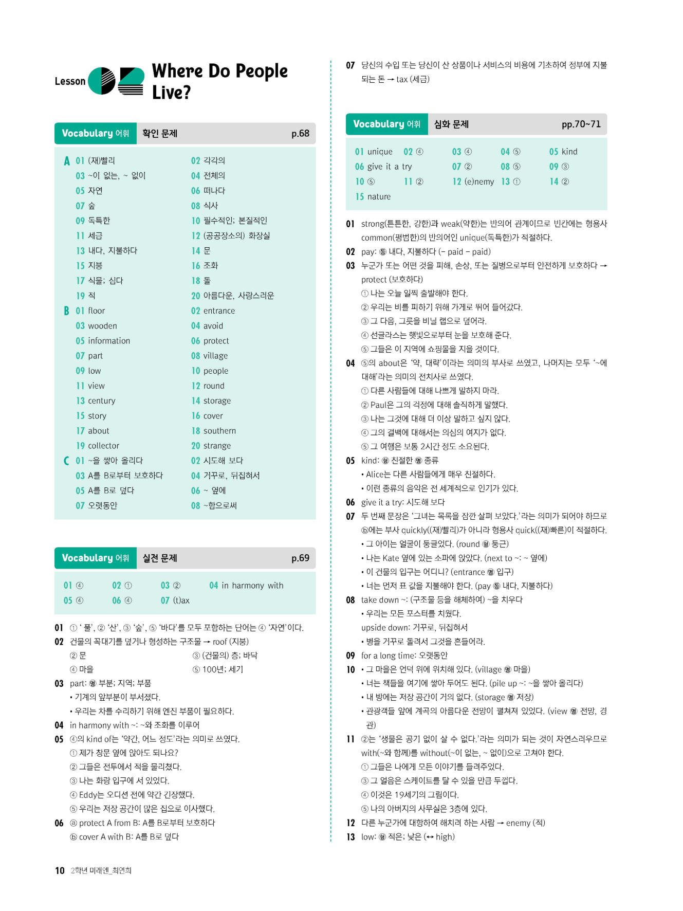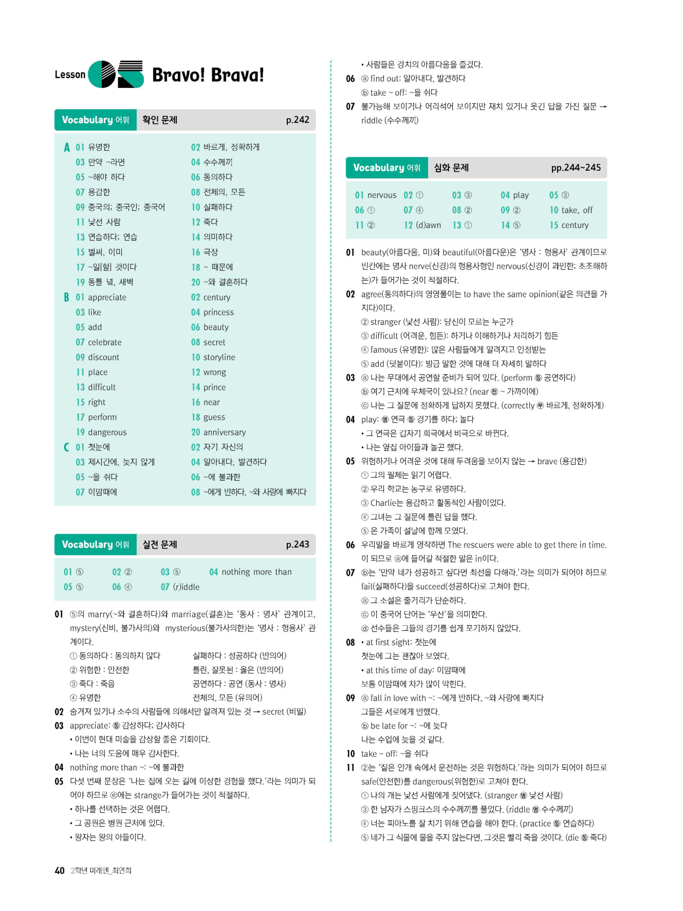 교과서 핵심 어휘 및 표현, 영영풀이, 확인 문제를 통해 어휘의 기본을 다지고 학교 시험에 출제된 다양한 유형의 어휘 문제를 실전/심화 단계별로 풀어봄으로써 실전에 완벽히 대비할 수 있도록 함