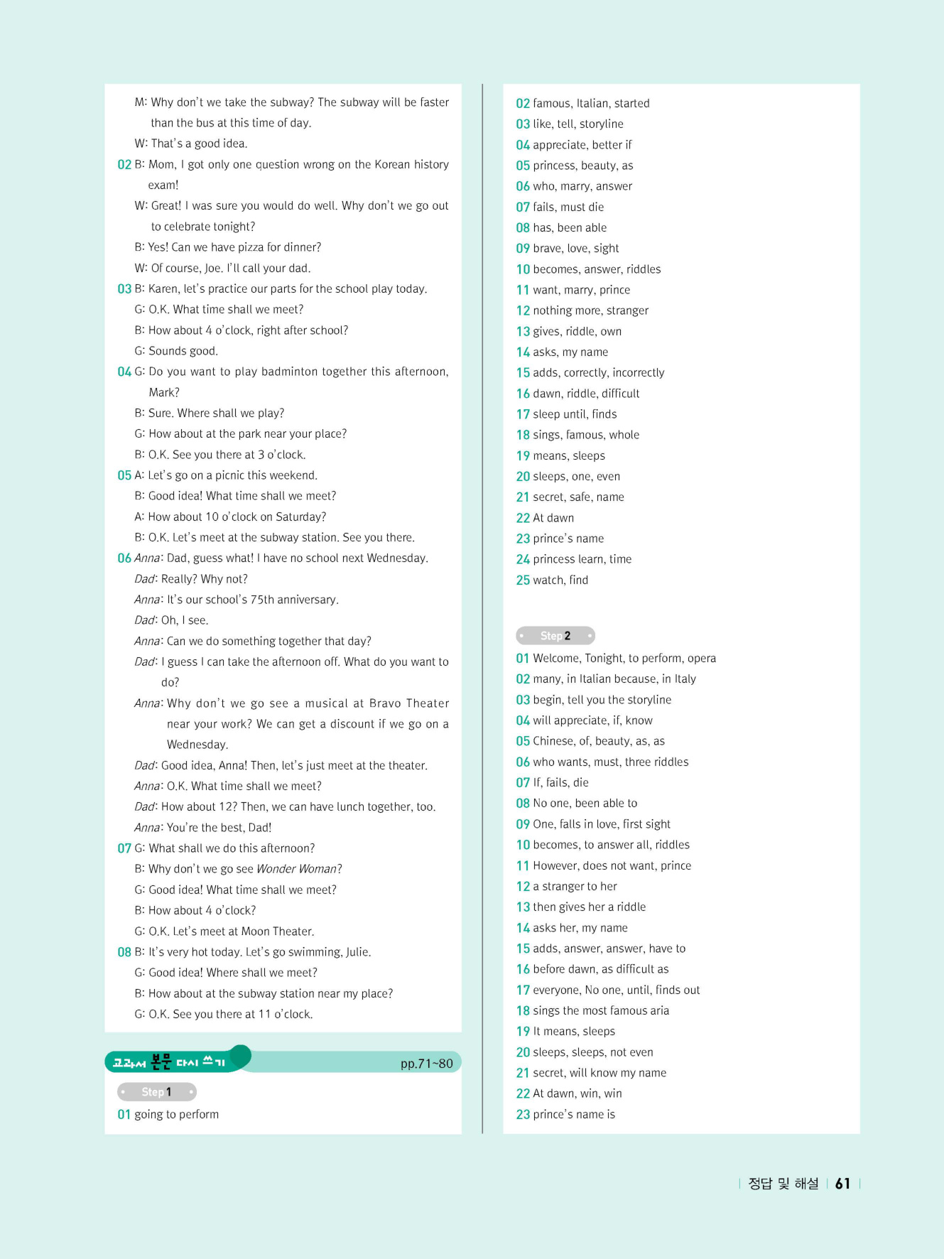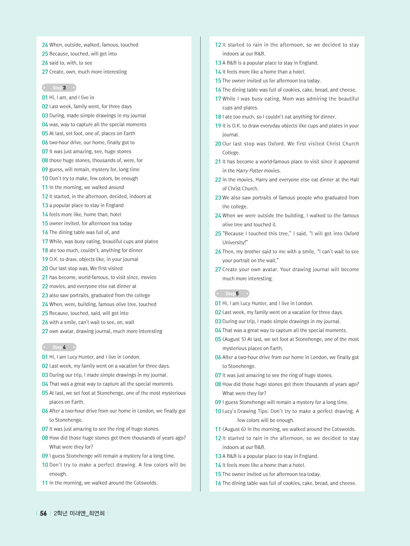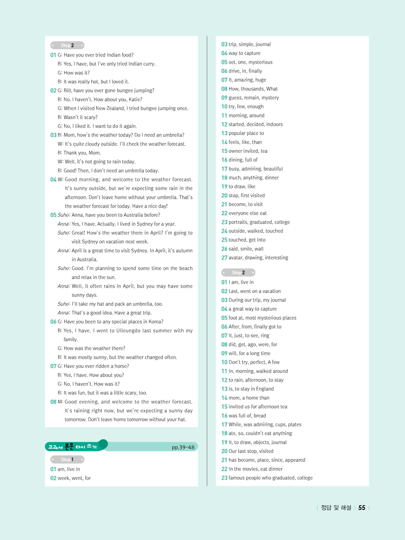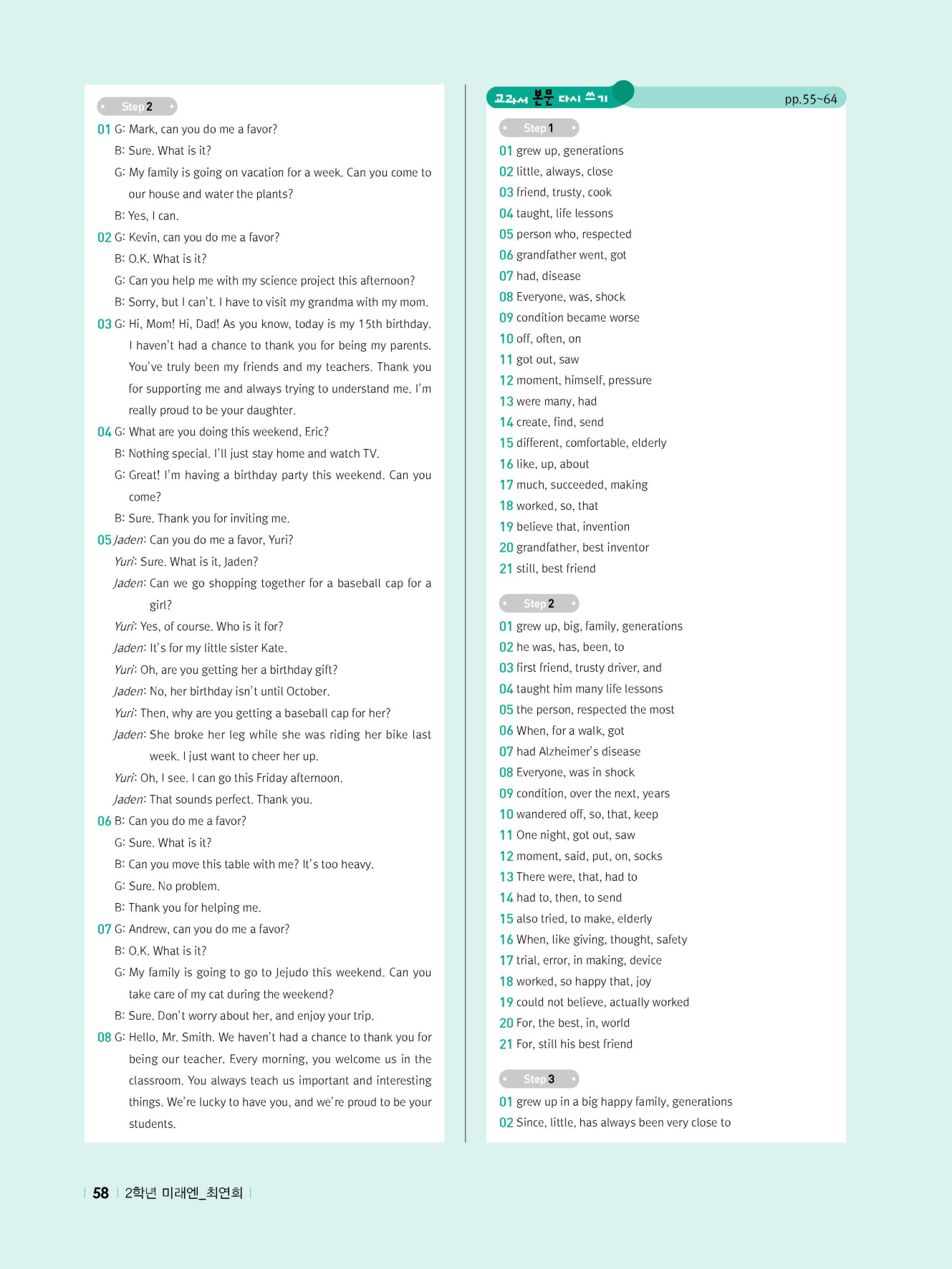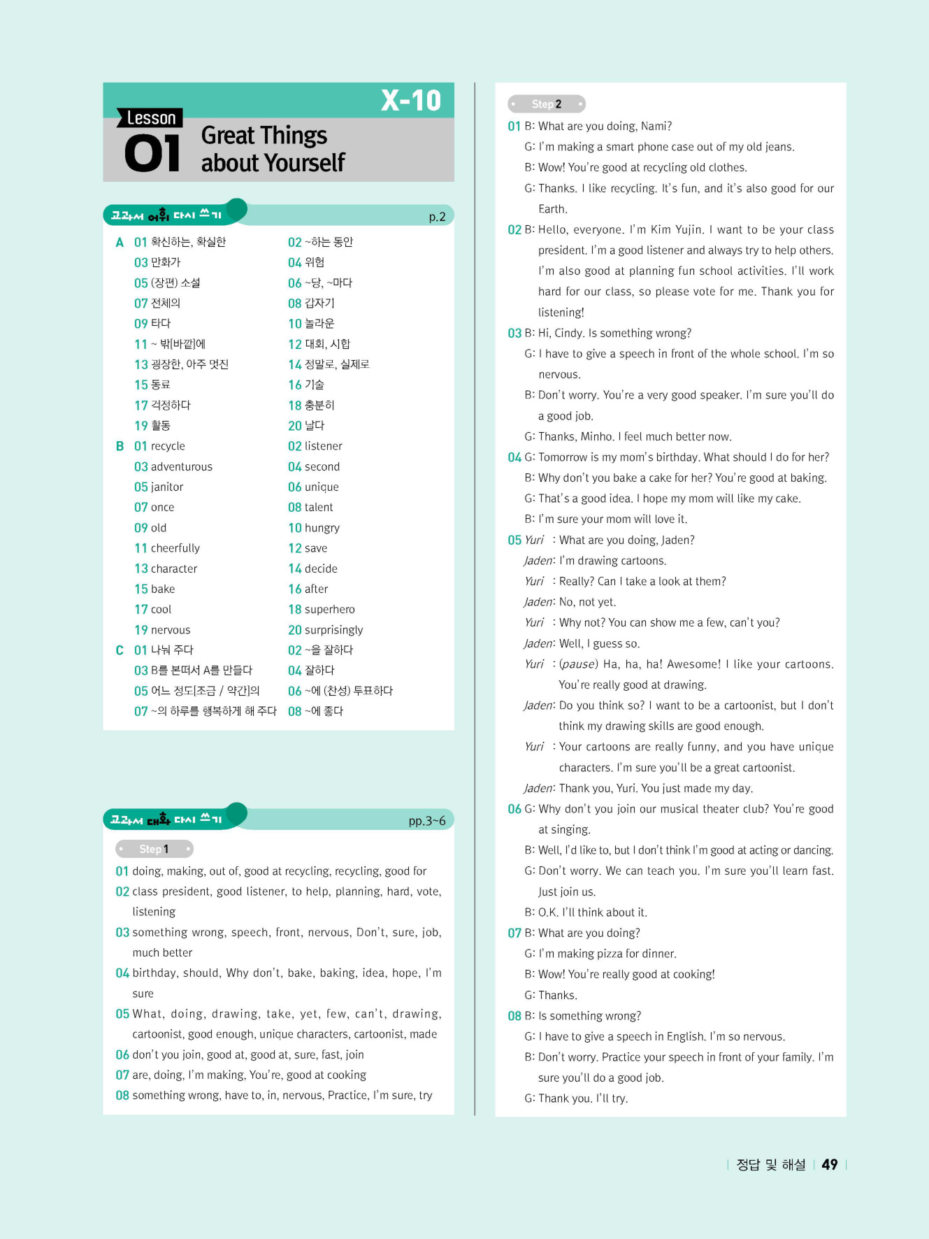 - 교과서 어휘 및 표현, 대화 2단계, 본문 5단계의 단계별 쓰기 강화 훈련 수록