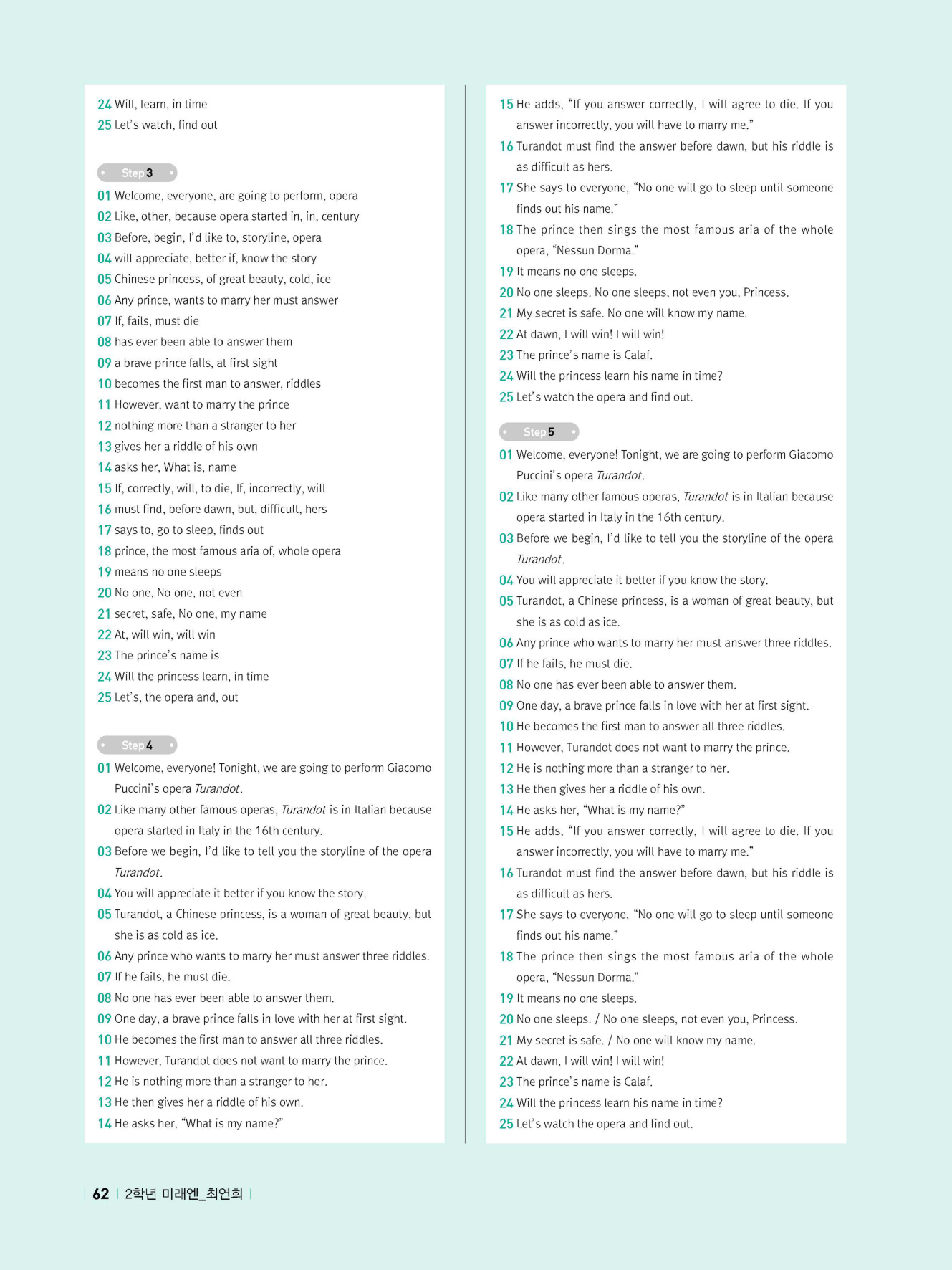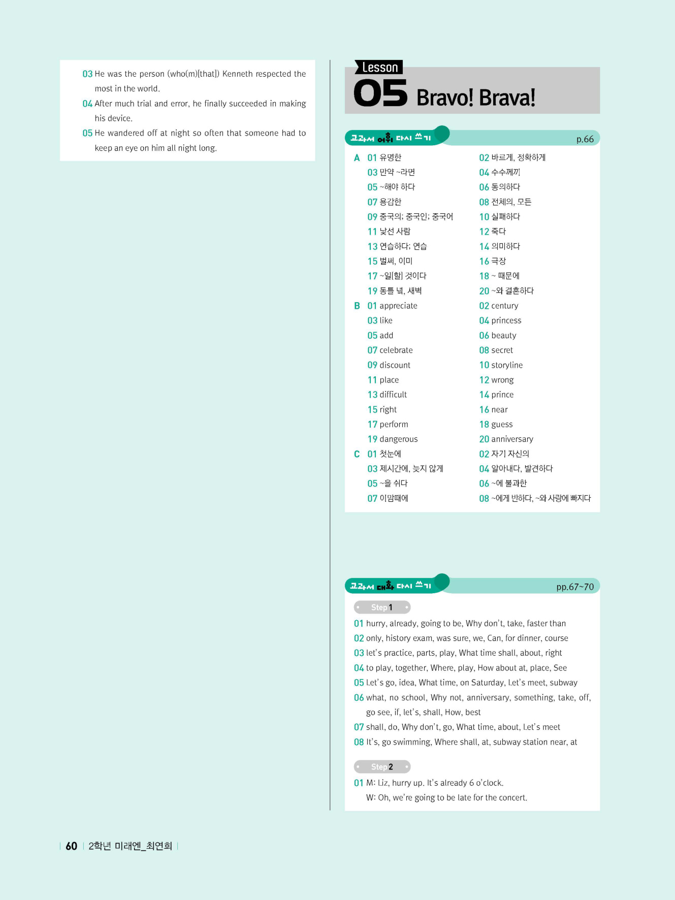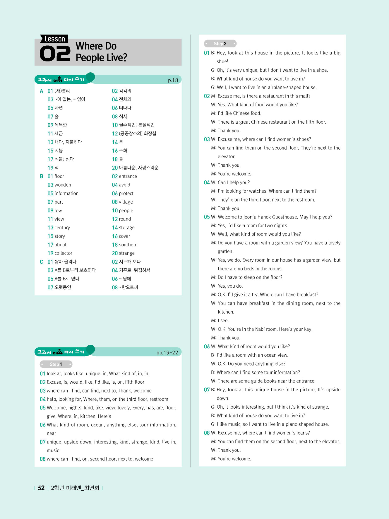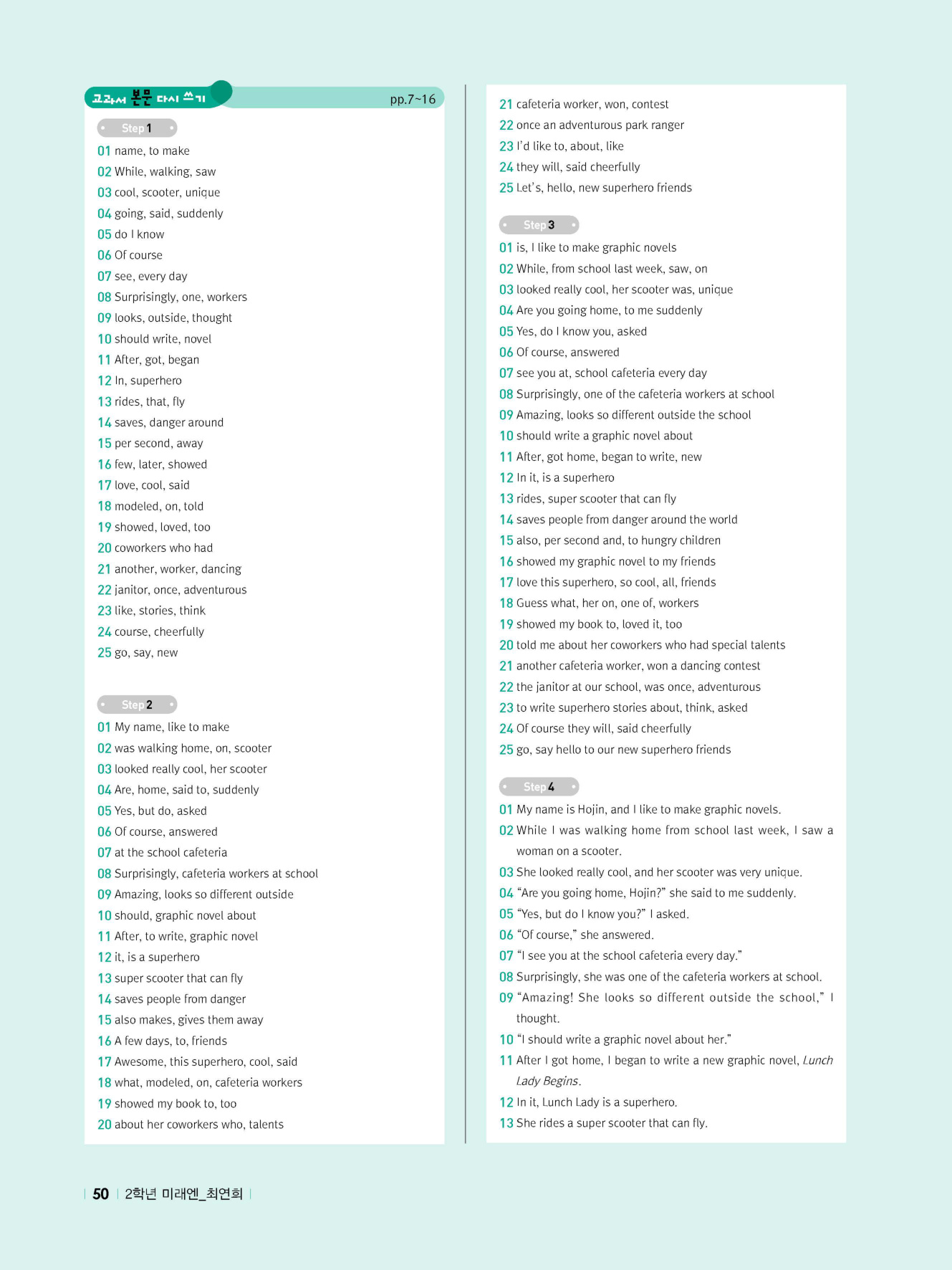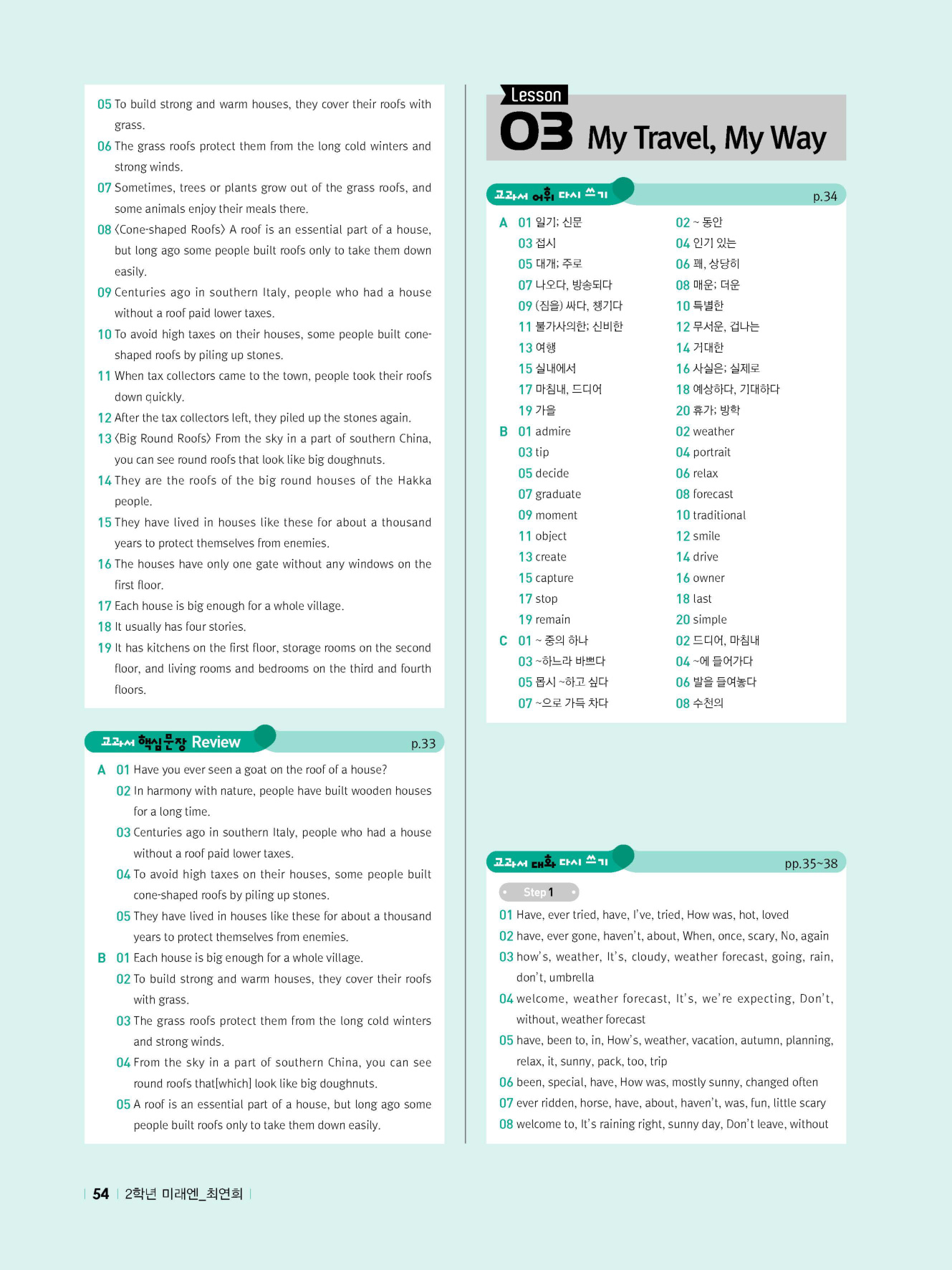 - 교과서 어휘 및 표현, 대화 2단계, 본문 5단계의 단계별 쓰기 강화 훈련 수록