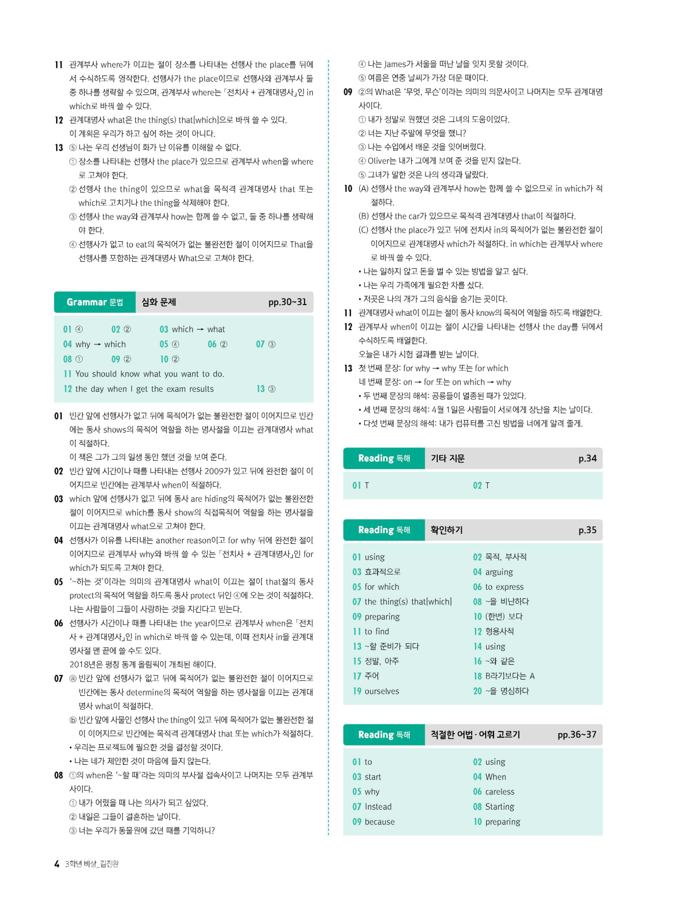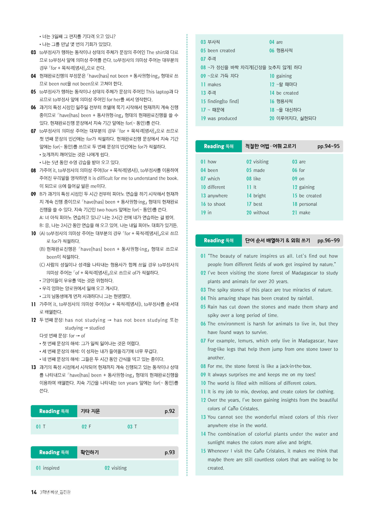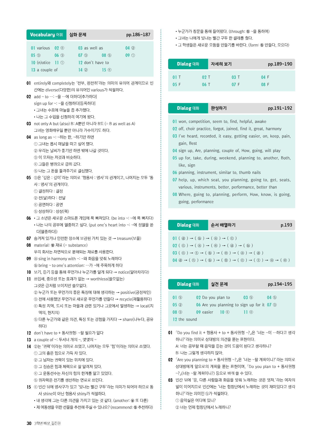 - 교과서 어휘 및 표현, 대화 2단계, 본문 5단계의 단계별 쓰기 강화 훈련 수록