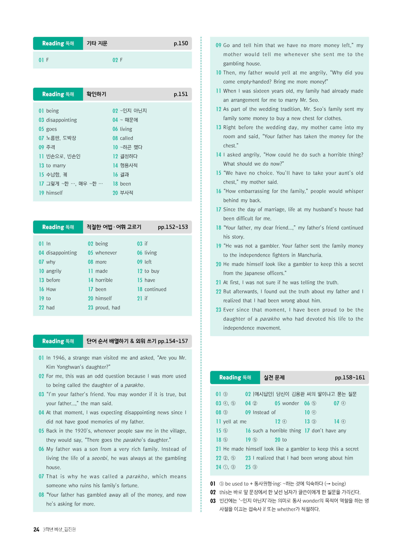 교과서 핵심 지문 및 기타 지문에 대한 심층 분석과 지문 완성하기/단어 순서 배열하기/외워 쓰기를 통해 본문을 완벽히 이해할 뿐만 아니라 문장 구성 및 작문 능력을 기를 수 있으며, 학교 시험에 출제된 다양한 유형의 읽기 문제를 실전/심화 단계별로 풀어봄으로써 실전에 완벽히 대비할 수 있도록 함