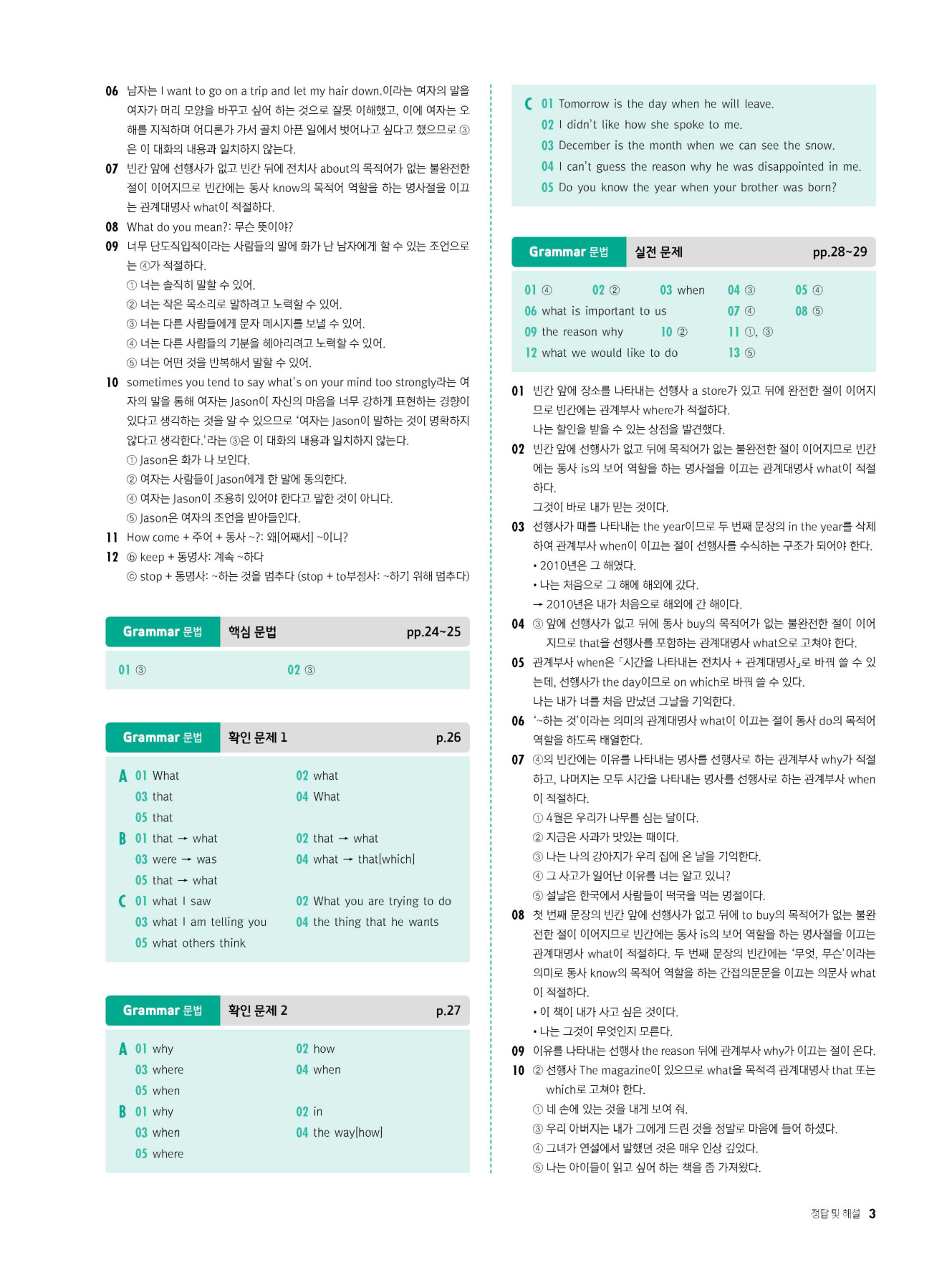 교과서 핵심 문법사항과 시험 출제 포인트를 익히고 확인 문제를 통해 각각의 문법사항에 대한 이해를 점검한 다음 학교 시험에 출제된 다양한 유형의 문법 문제를 확인/실전/심화 단계별로 풀어봄으로써 실전에 완벽히 대비할 수 있도록 함