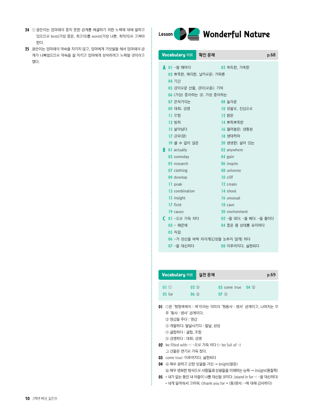 교과서 핵심 어휘 및 표현, 영영풀이, 확인 문제를 통해 어휘의 기본을 다지고 학교 시험에 출제된 다양한 유형의 어휘 문제를 실전/심화 단계별로 풀어봄으로써 실전에 완벽히 대비할 수 있도록 함