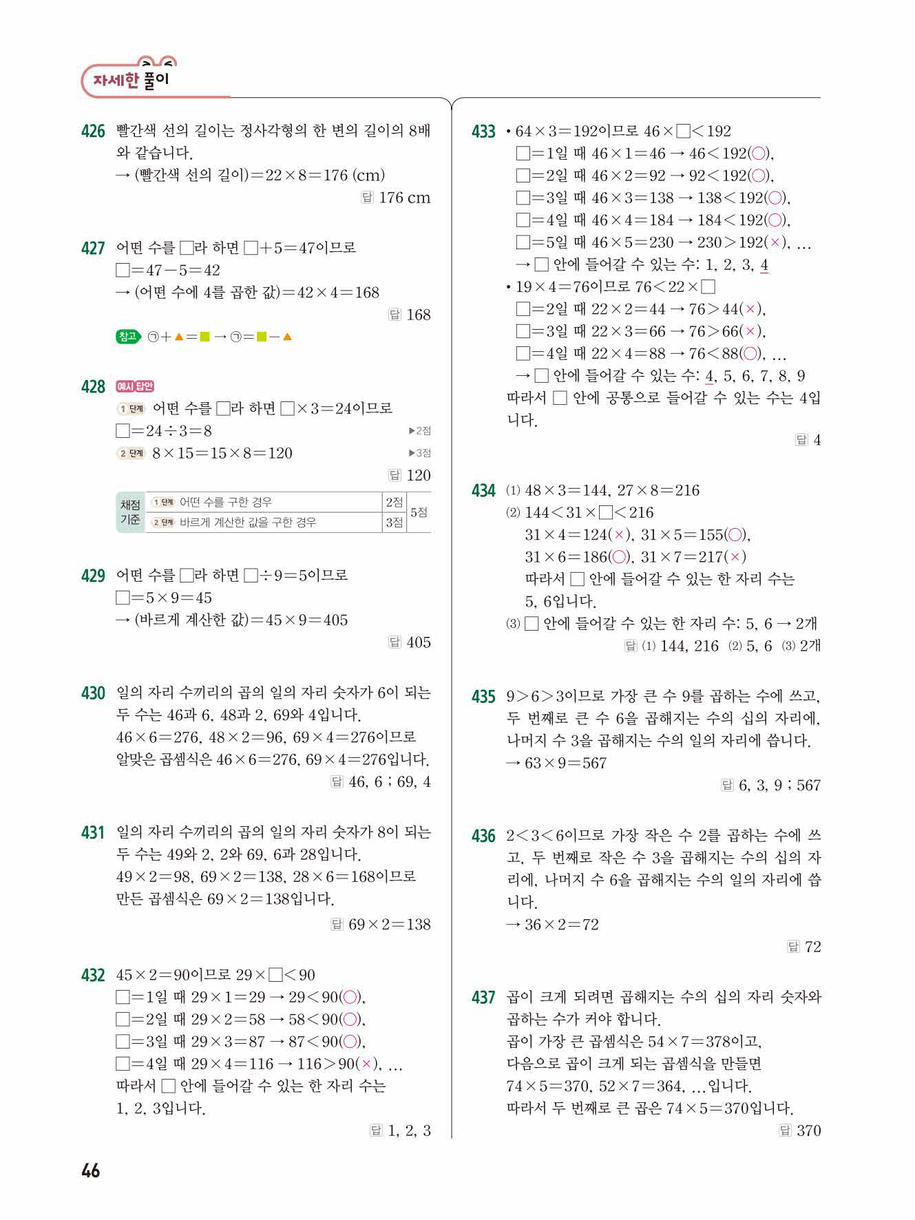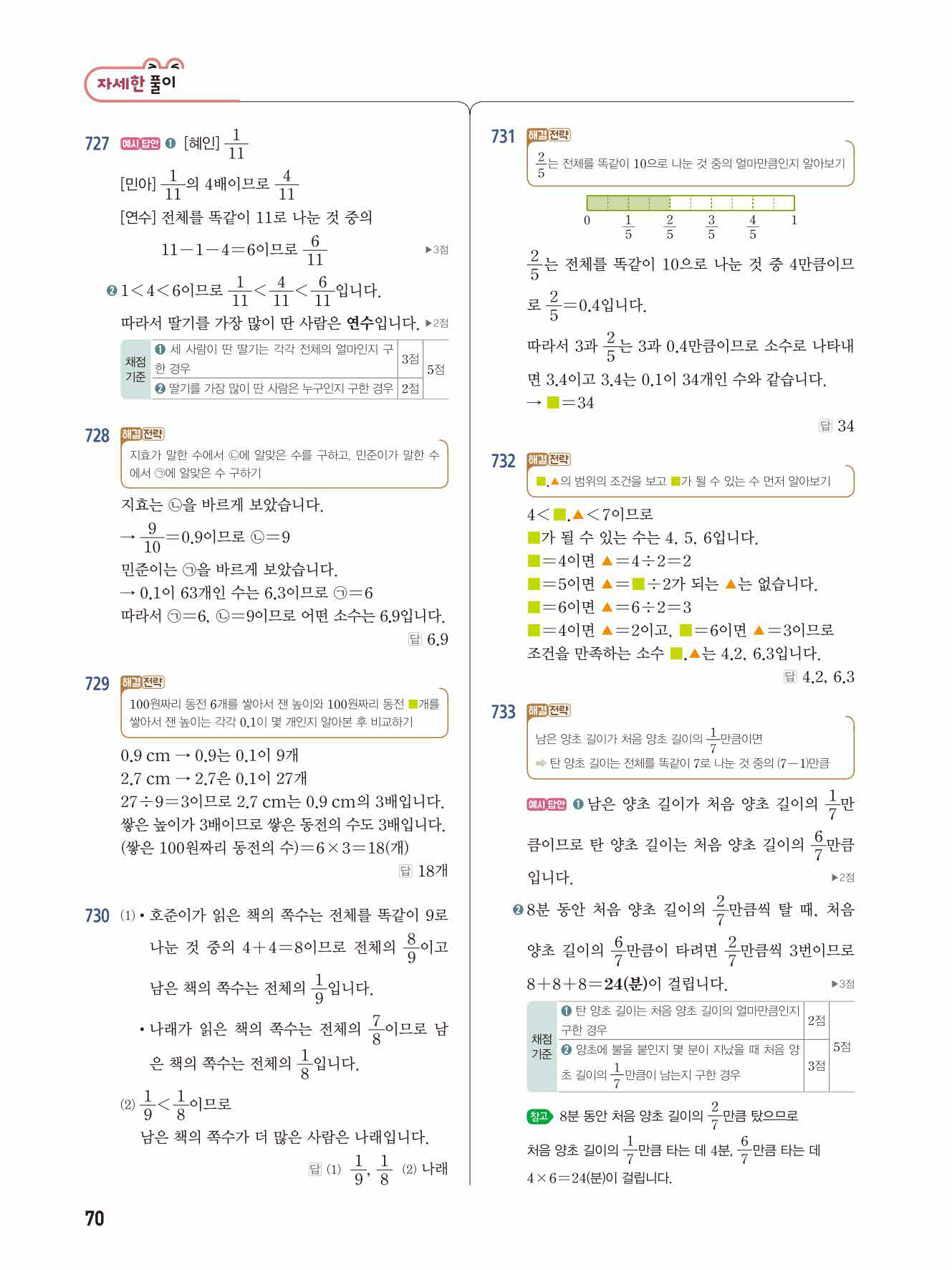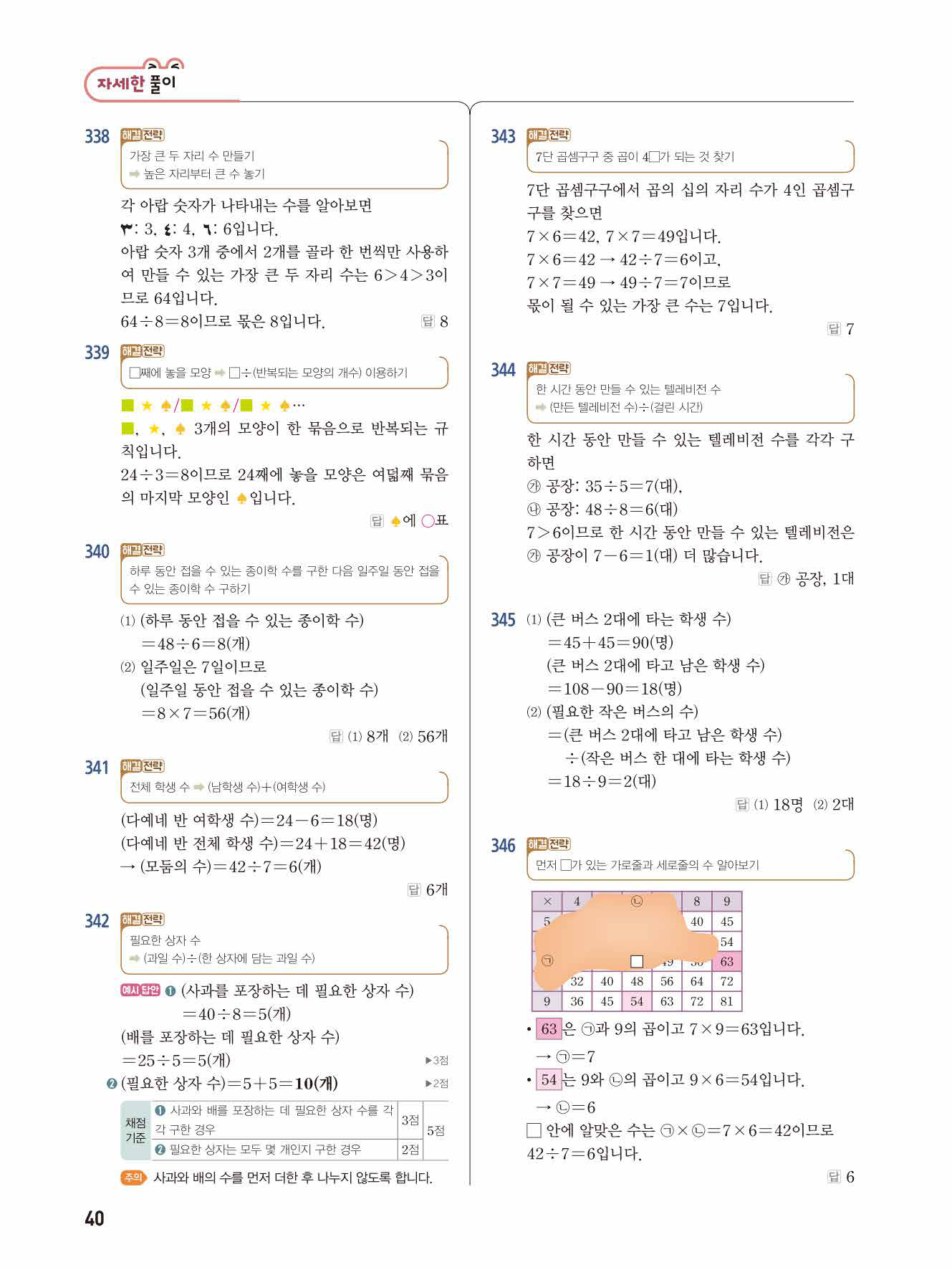 교과서 개념과 익힘책 및 학교 시험 문제를 바탕으로 초등수학 해당 학년에서 다뤄야 하는 모든 수학 문제를 유형별로 분류하고 정리하였으므로 유형별로 충분한 문제 연습을 통해 문제 해결력을 키울 수 있습니다.