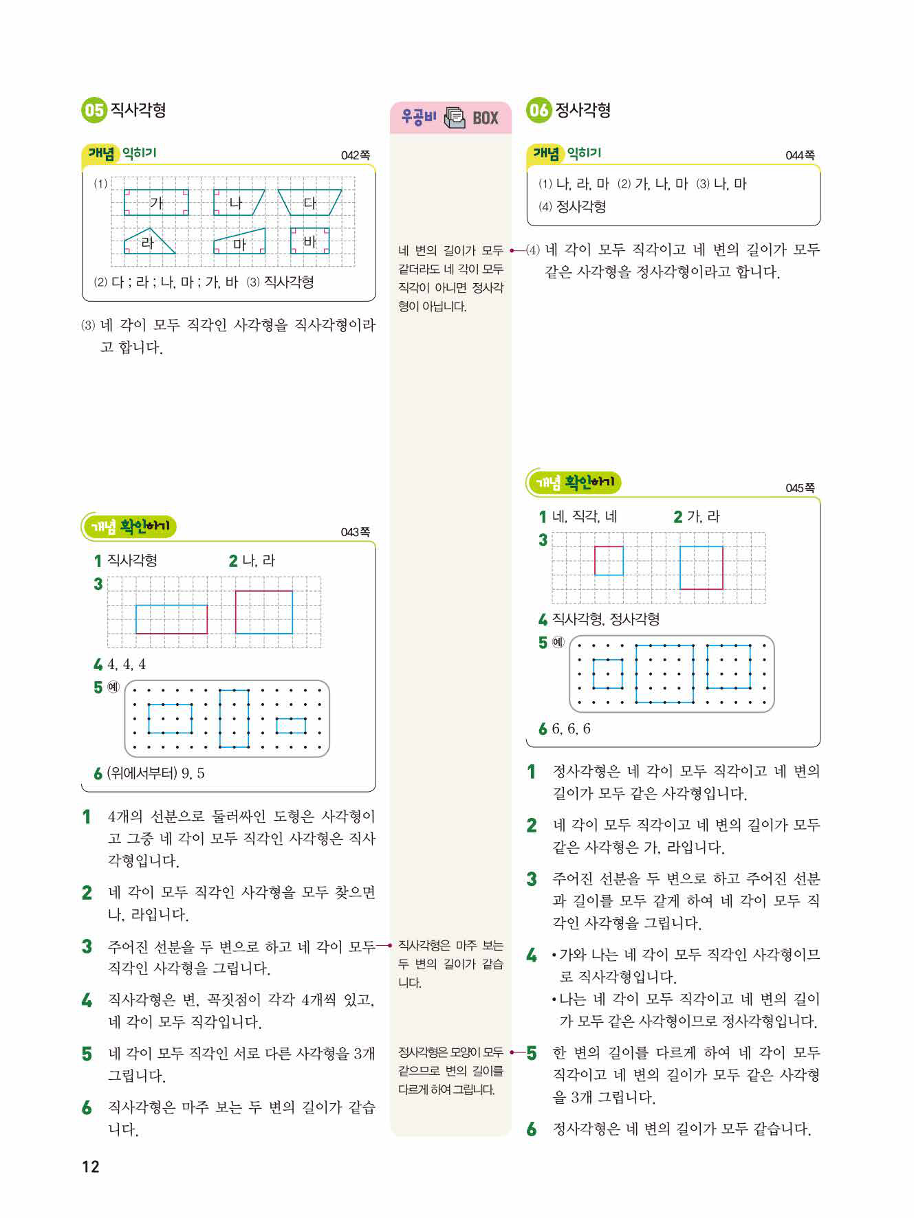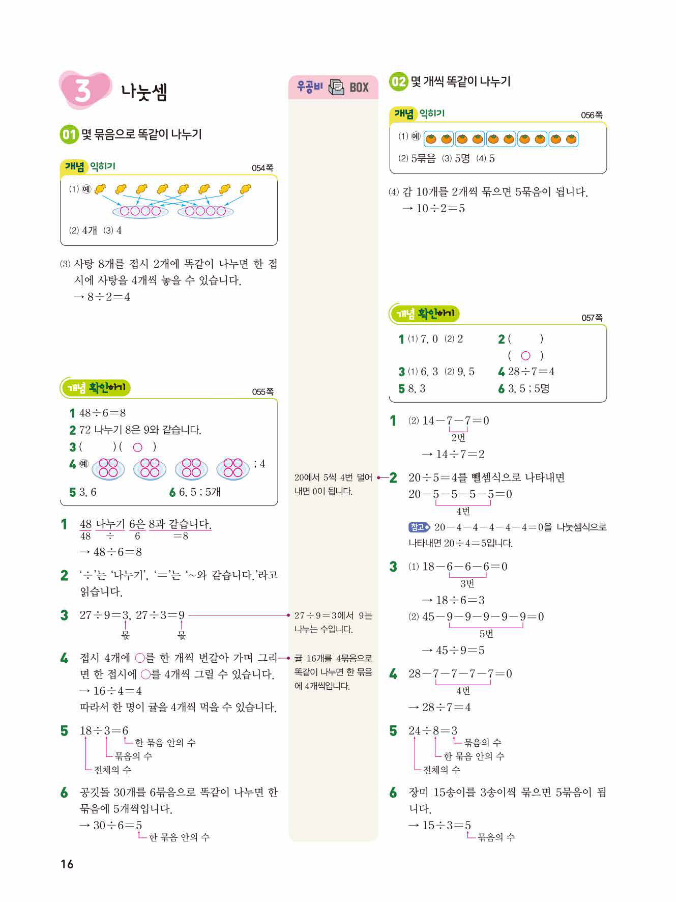 1. 개념+확인문제: 단원의 핵심 내용을 체계적으로 정리하고, 확인문제를 통해 중요한 개념을 다시 한 번 다집니다.