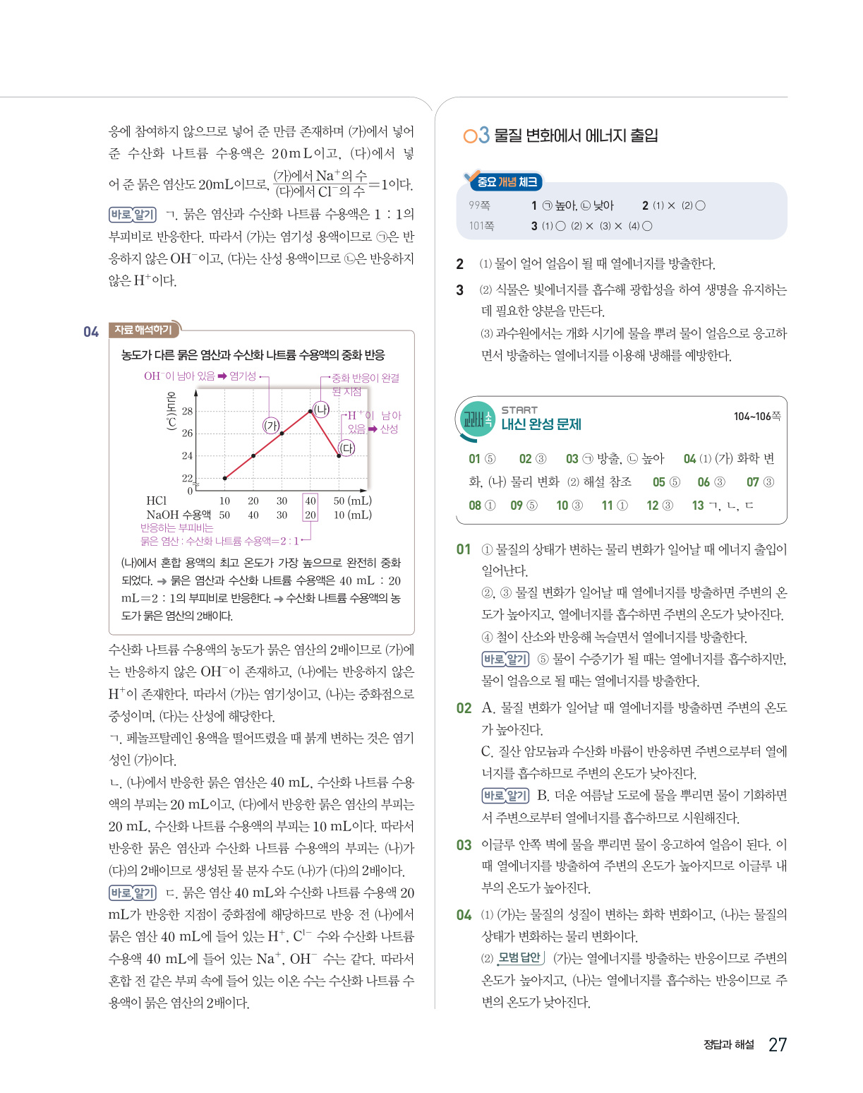 5종 교과서를 완벽 분석하여 체계적인 개념정리와 단계별 문제로 탄탄한 실력을 완성할 수 있다. 풍부한 사진 자료와 내용 분석, 심화 콘텐츠로 과학 실력의 깊이를 더해 줄 수 있다. 또, 교과서에 수록된 필수 탐구의 과정과 결과를 이해하기 쉽도록 QR 영상을 제공하며, 자세하고 친절한 해설이 수록되어 있다.