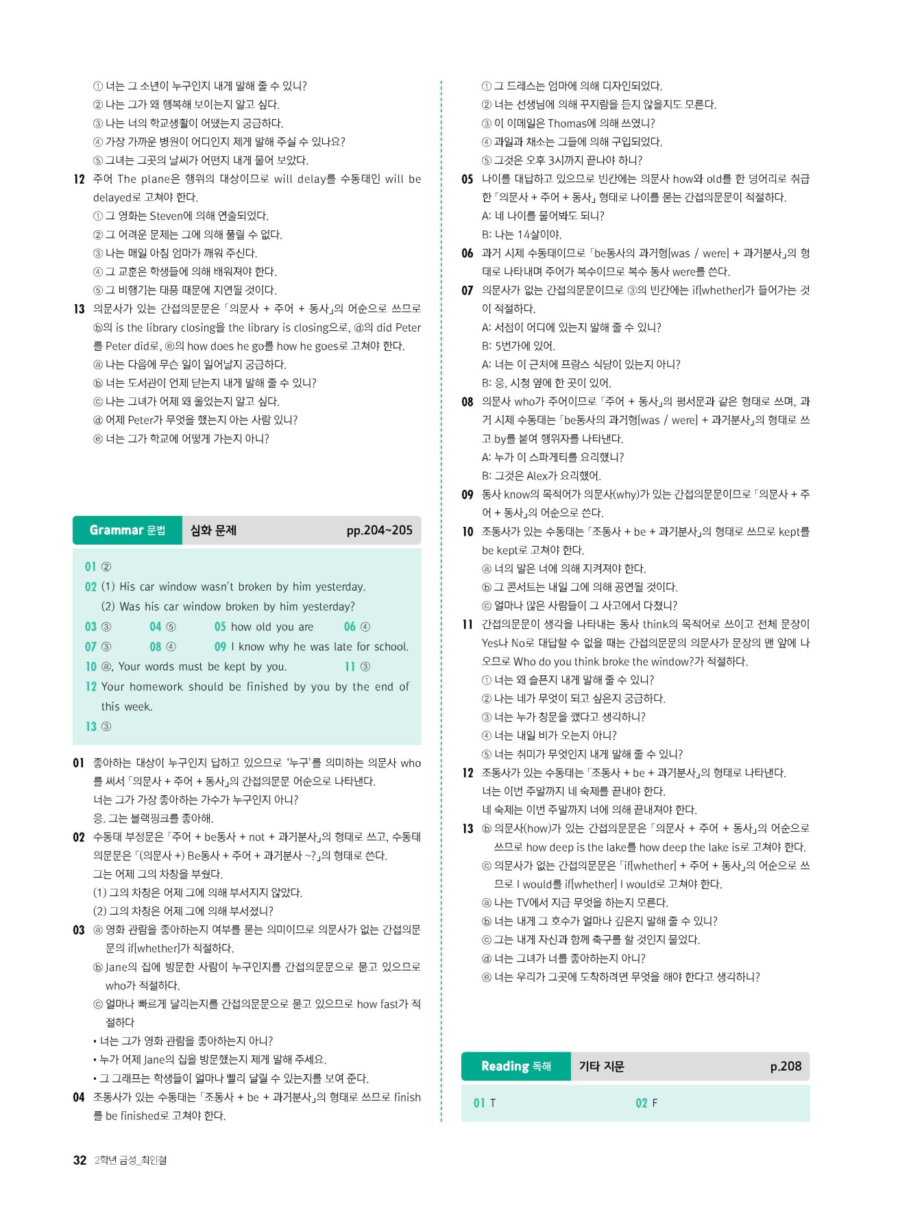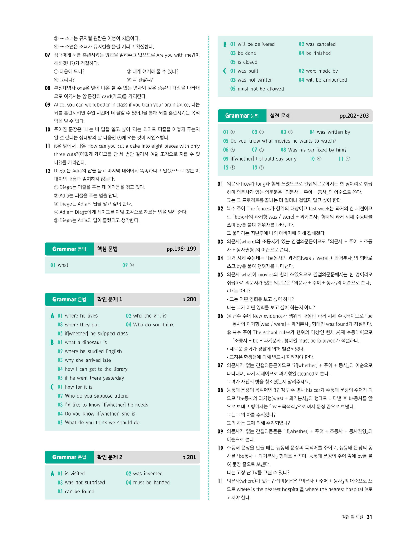 교과서 핵심 문법사항과 시험 출제 포인트를 익히고 확인 문제를 통해 각각의 문법사항에 대한 이해를 점검한 다음 학교 시험에 출제된 다양한 유형의 문법 문제를 확인/실전/심화 단계별로 풀어봄으로써 실전에 완벽히 대비할 수 있도록 함