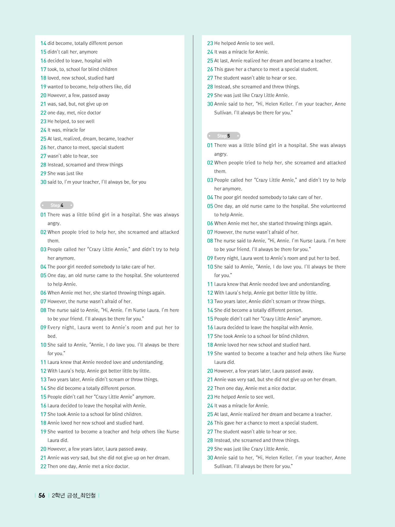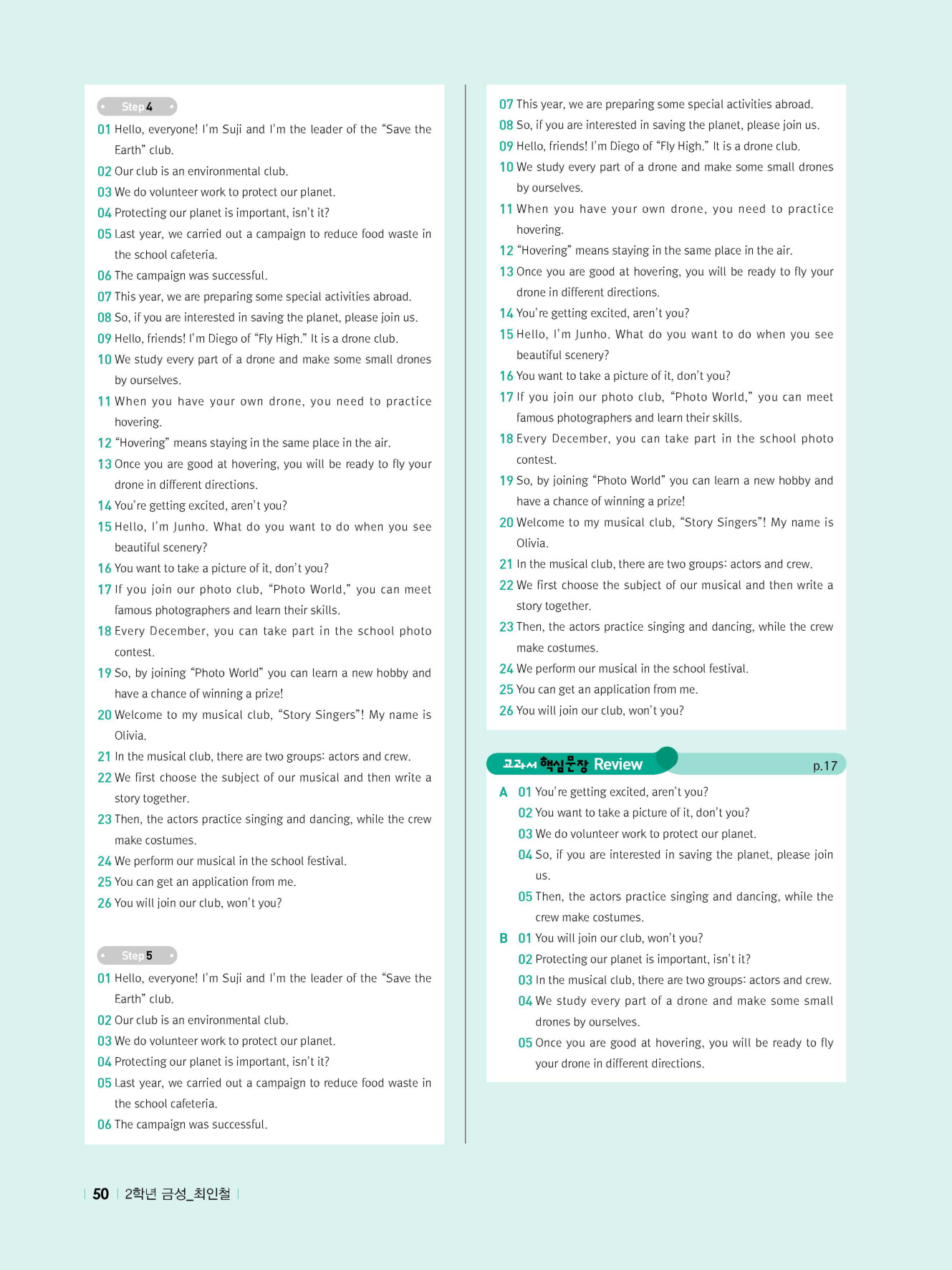 - 교과서 어휘 및 표현, 대화 2단계, 본문 5단계의 단계별 쓰기 강화 훈련 수록