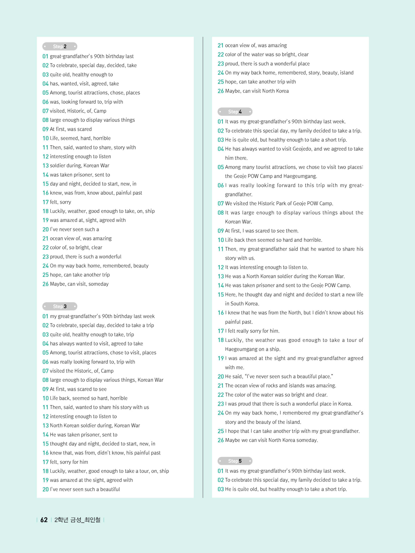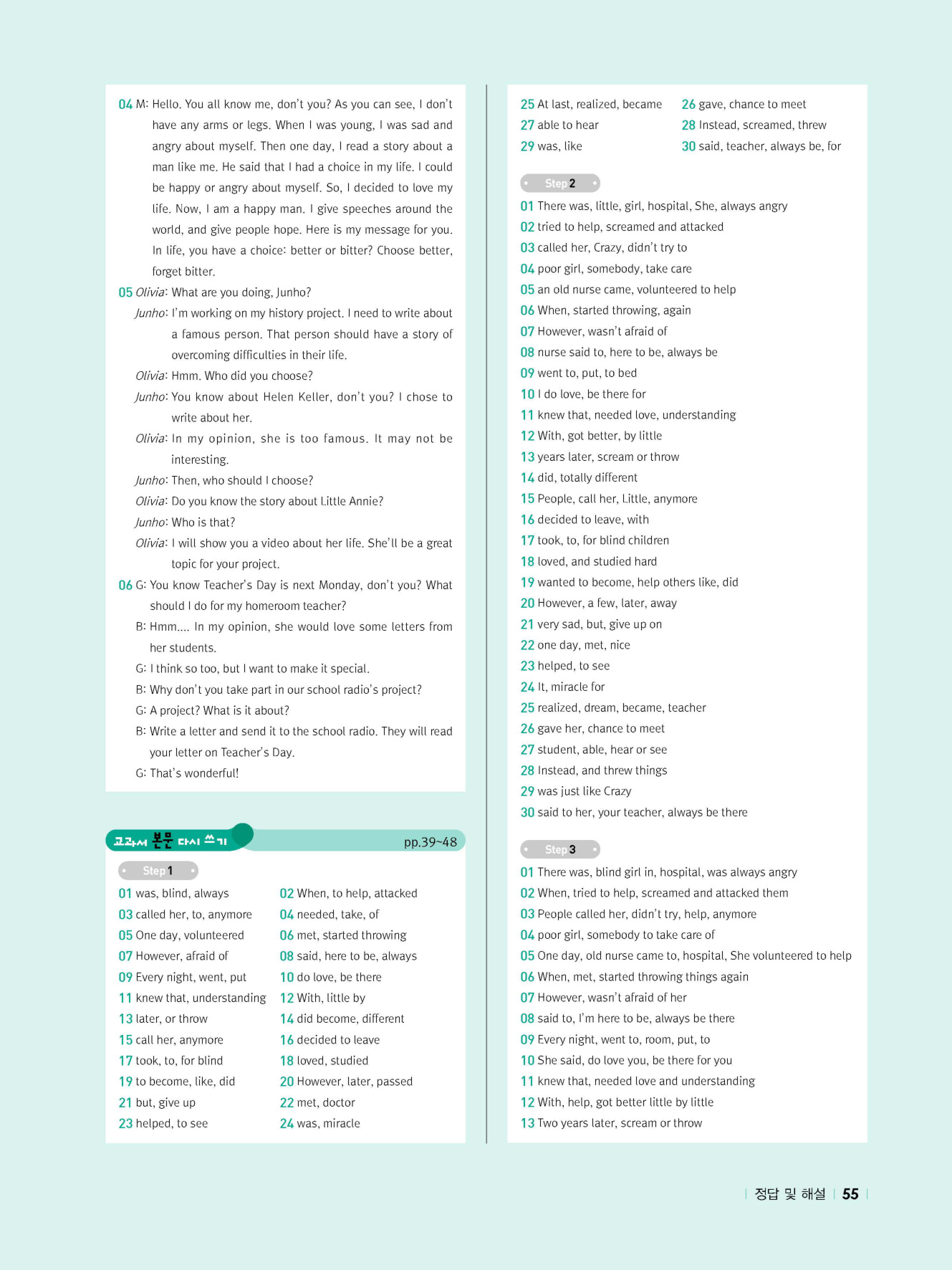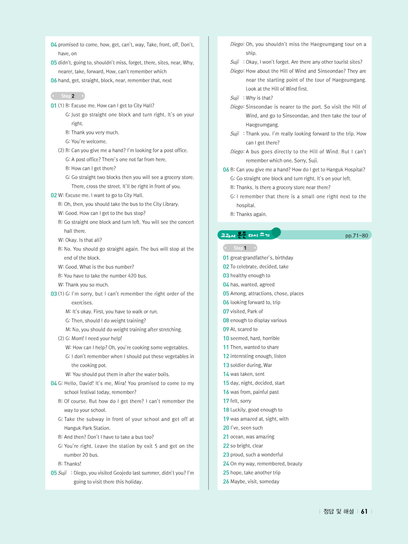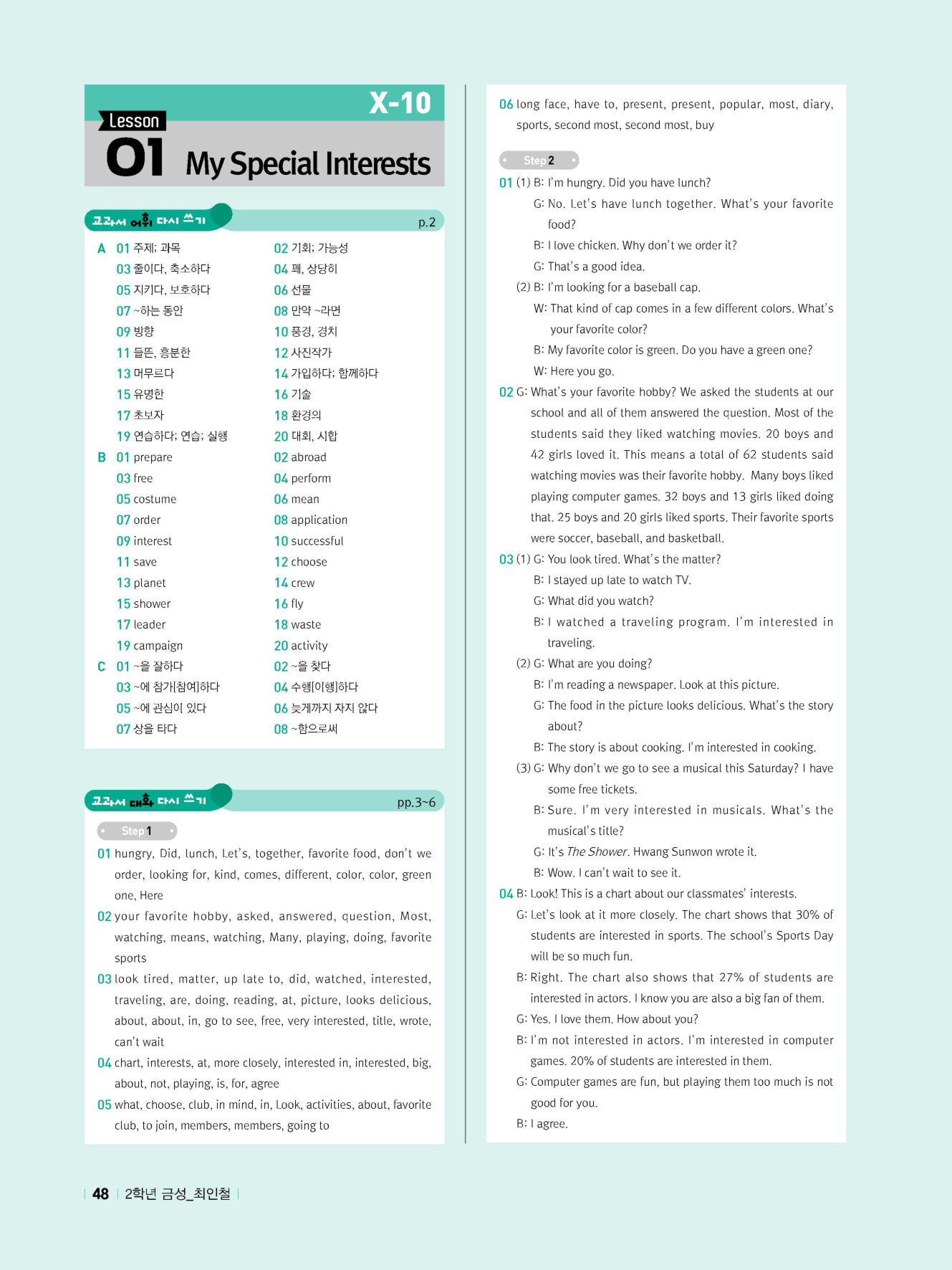 - 교과서 어휘 및 표현, 대화 2단계, 본문 5단계의 단계별 쓰기 강화 훈련 수록