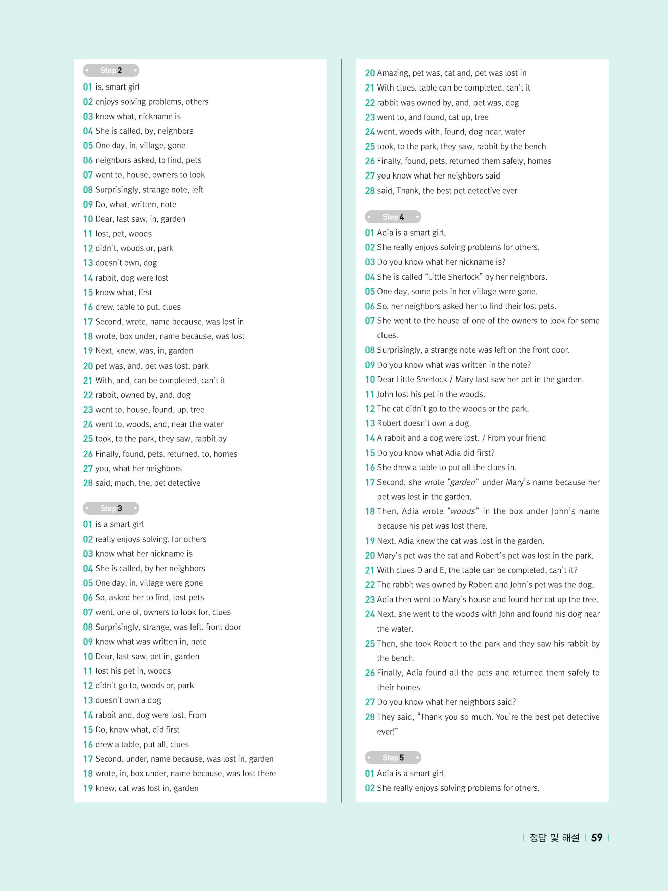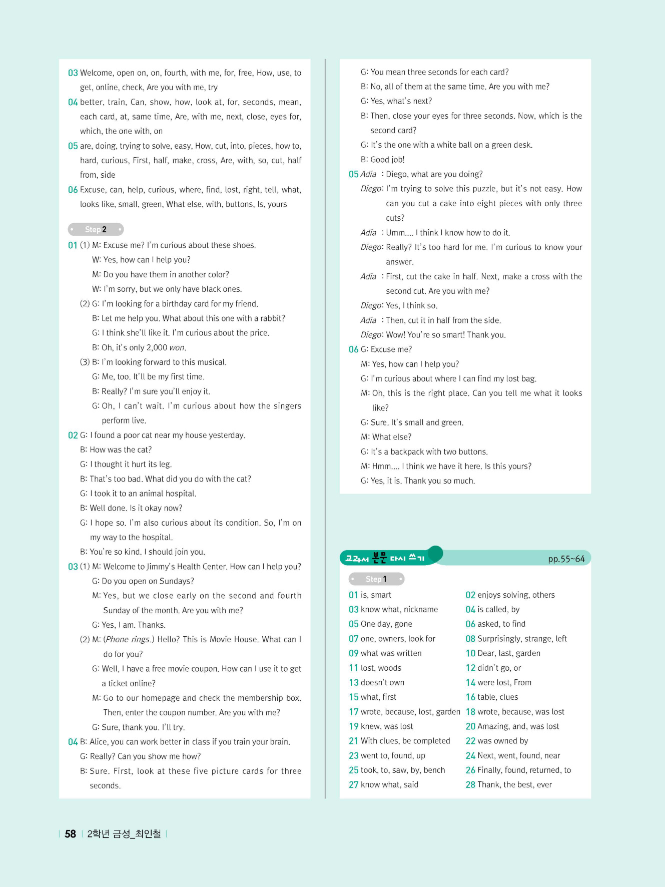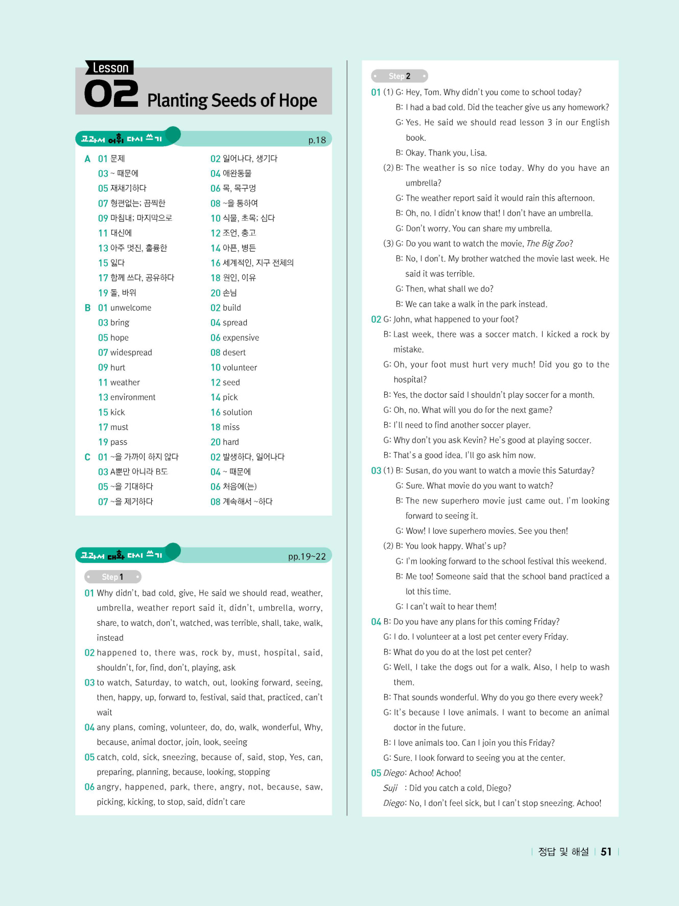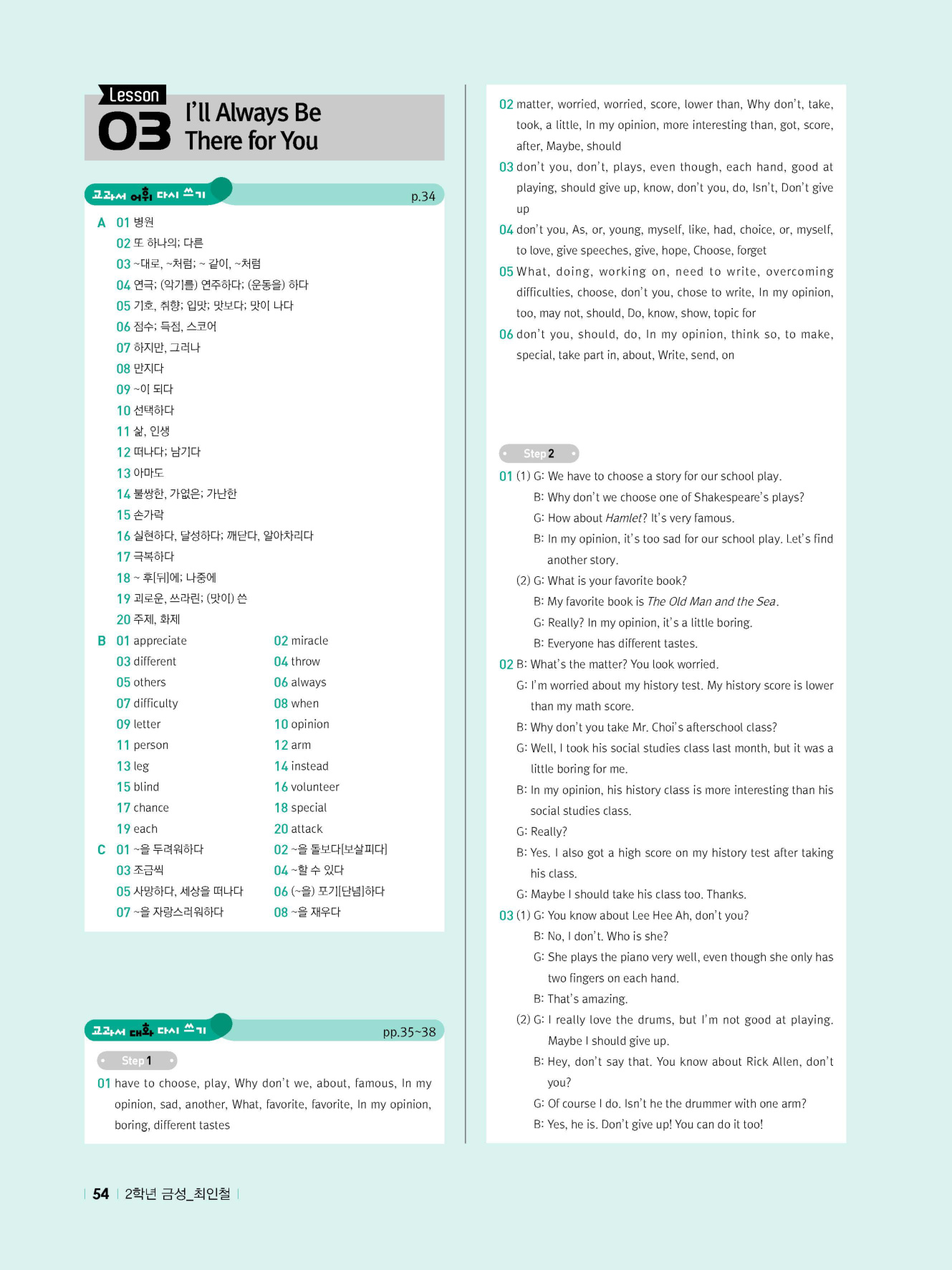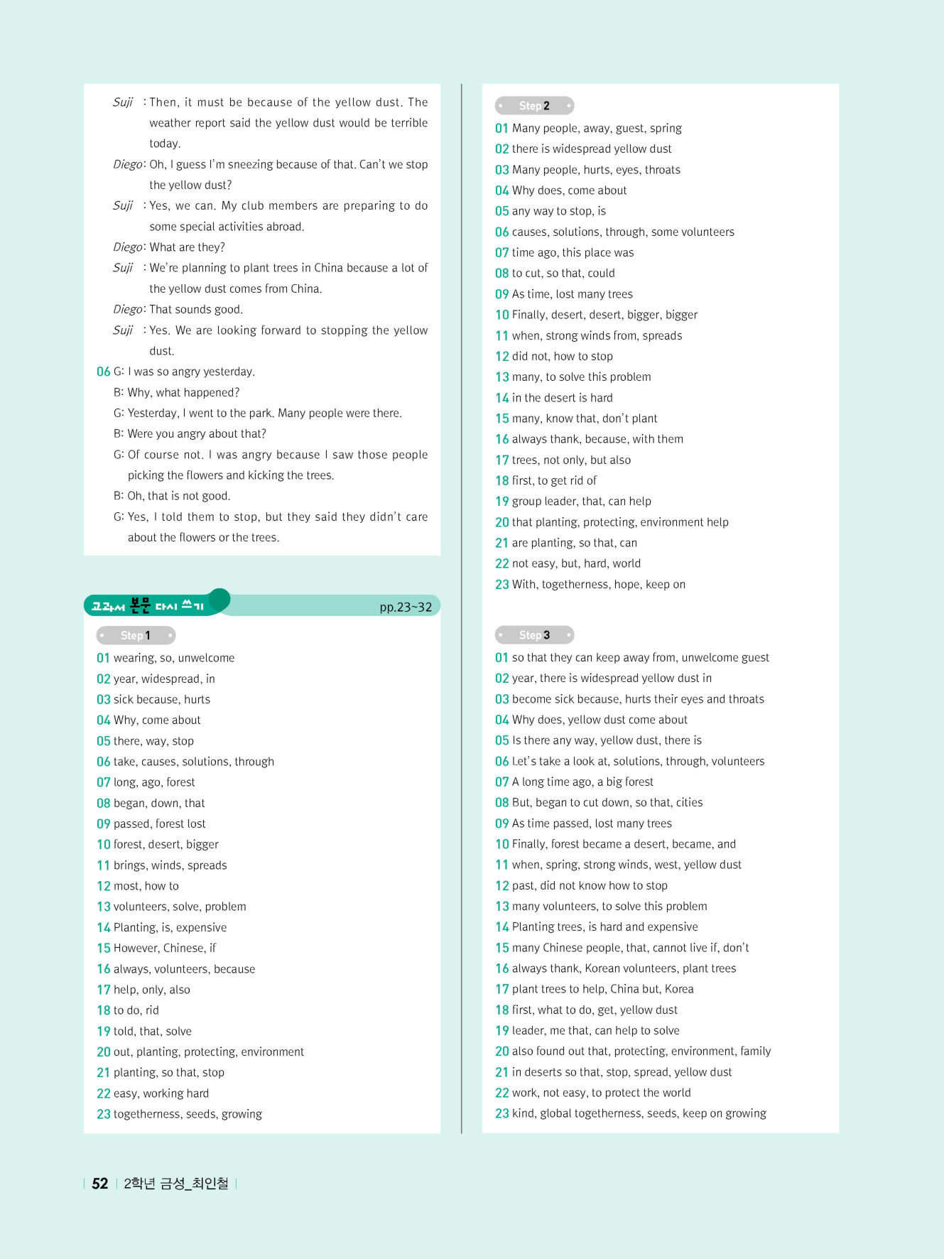 - 교과서 어휘 및 표현, 대화 2단계, 본문 5단계의 단계별 쓰기 강화 훈련 수록