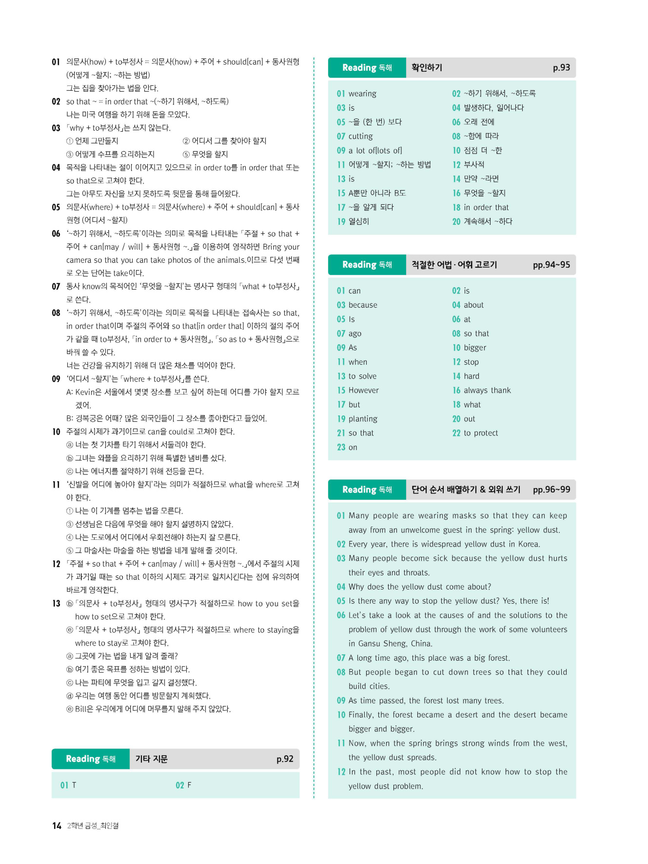 교과서 핵심 지문 및 기타 지문에 대한 심층 분석과 지문 완성하기/단어 순서 배열하기/외워 쓰기를 통해 본문을 완벽히 이해할 뿐만 아니라 문장 구성 및 작문 능력을 기를 수 있으며, 학교 시험에 출제된 다양한 유형의 읽기 문제를 실전/심화 단계별로 풀어봄으로써 실전에 완벽히 대비할 수 있도록 함
