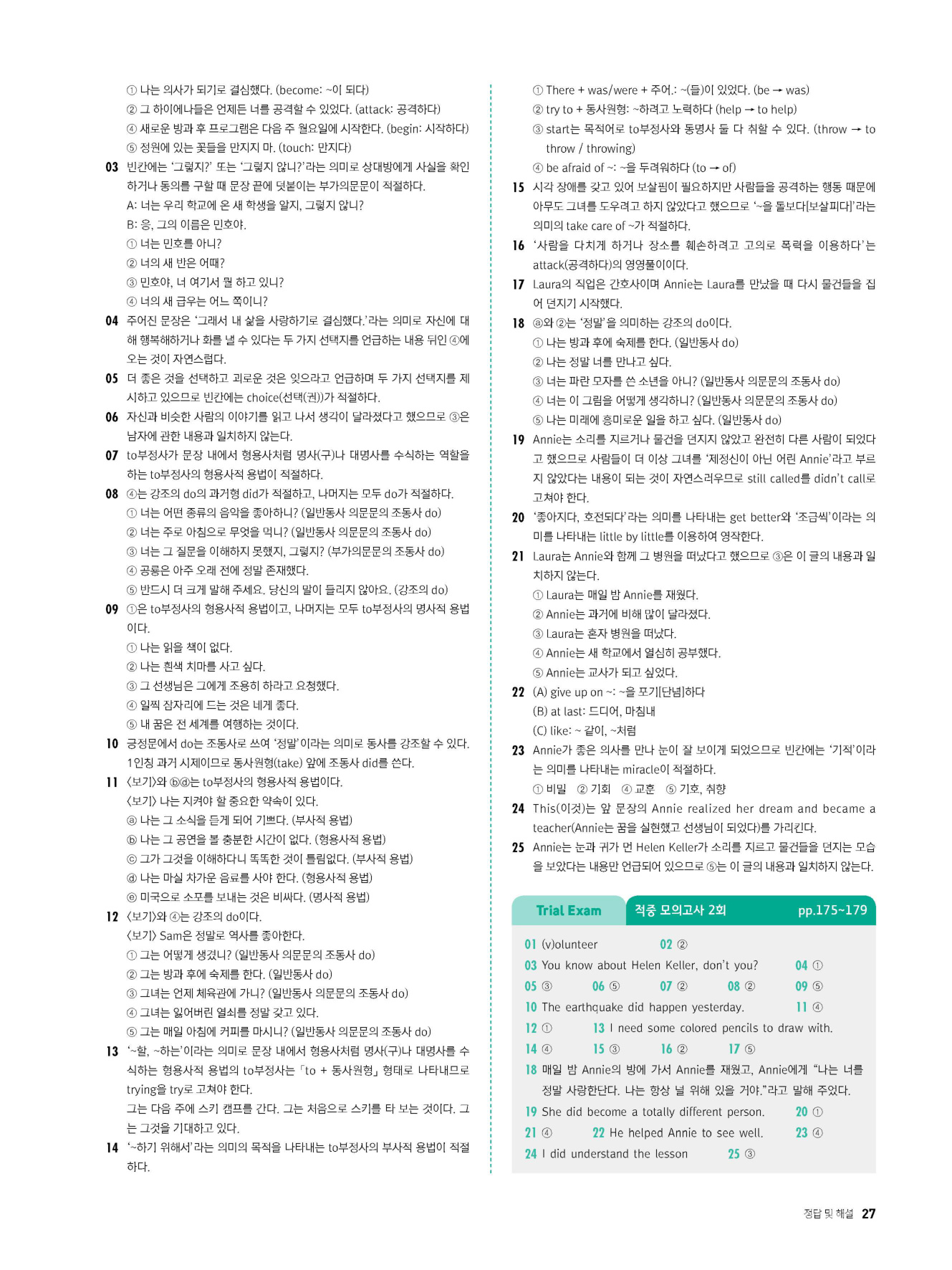어휘, 대화, 문법, 독해 영역별로 다양한 유형의 서술형 문제를 풀어 봄으로써 학교 시험에서 비중이 확대되고 있는 서술형 평가에 완벽히 대비할 수 있도록 함