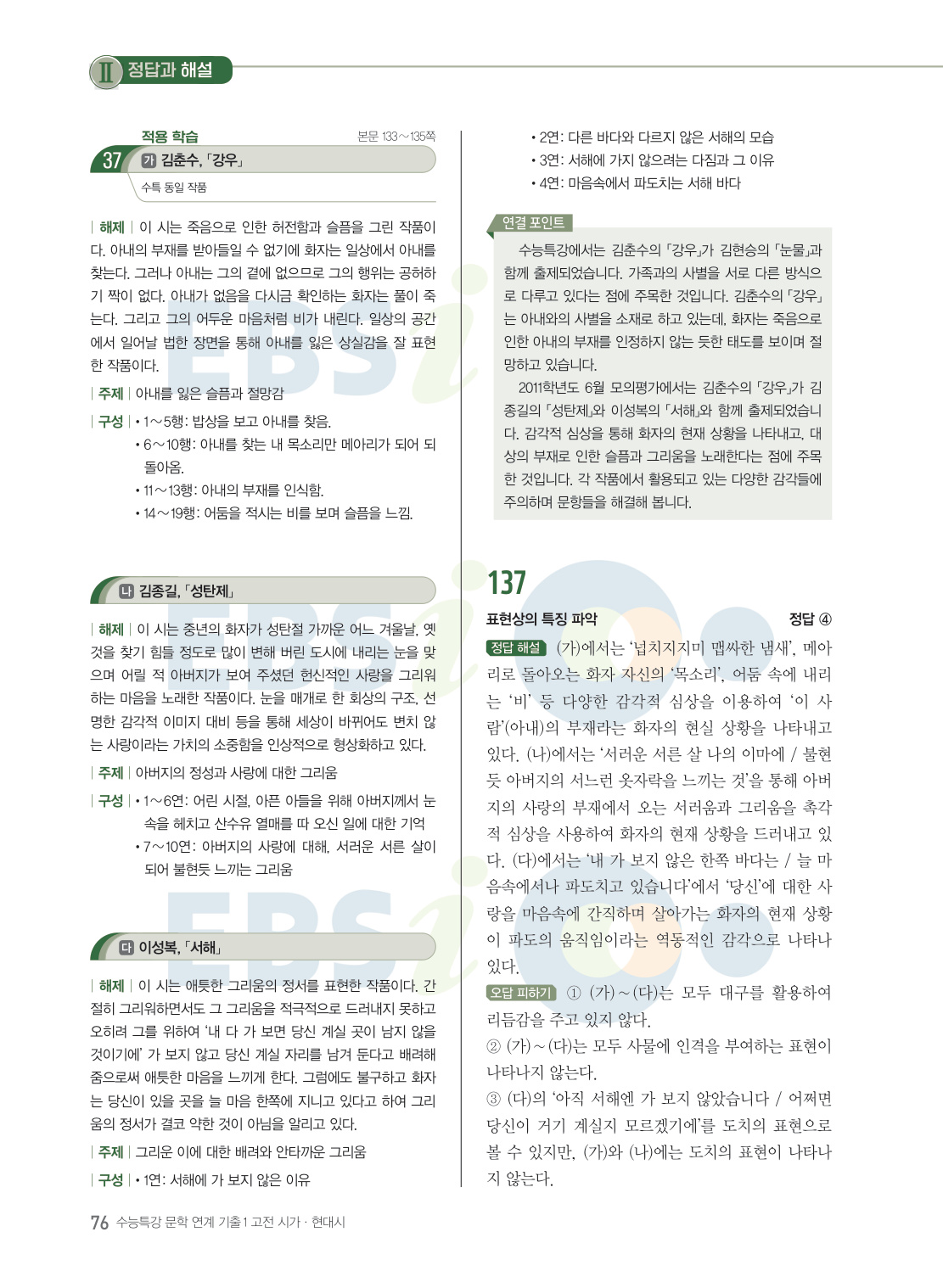 『수능특강 문학』에 수록된 지문과 연관성이 있는 기출 문항을 풀어 봄으로써 연계교재에서 출제되지 않은 나머지 문항도 대비 가능한 교재다. 『수능특강 연계 기출 문학작품 연계 기출1 고전시가·현대시』는 수능특강 수록 작품과 수록 작가의 또 다른 작품을 다른 기출문제를 수록하였다. 신뢰도 있는 기출 문항을 수록하여 연계와 비연계를 동시에 대비할 수 있다.