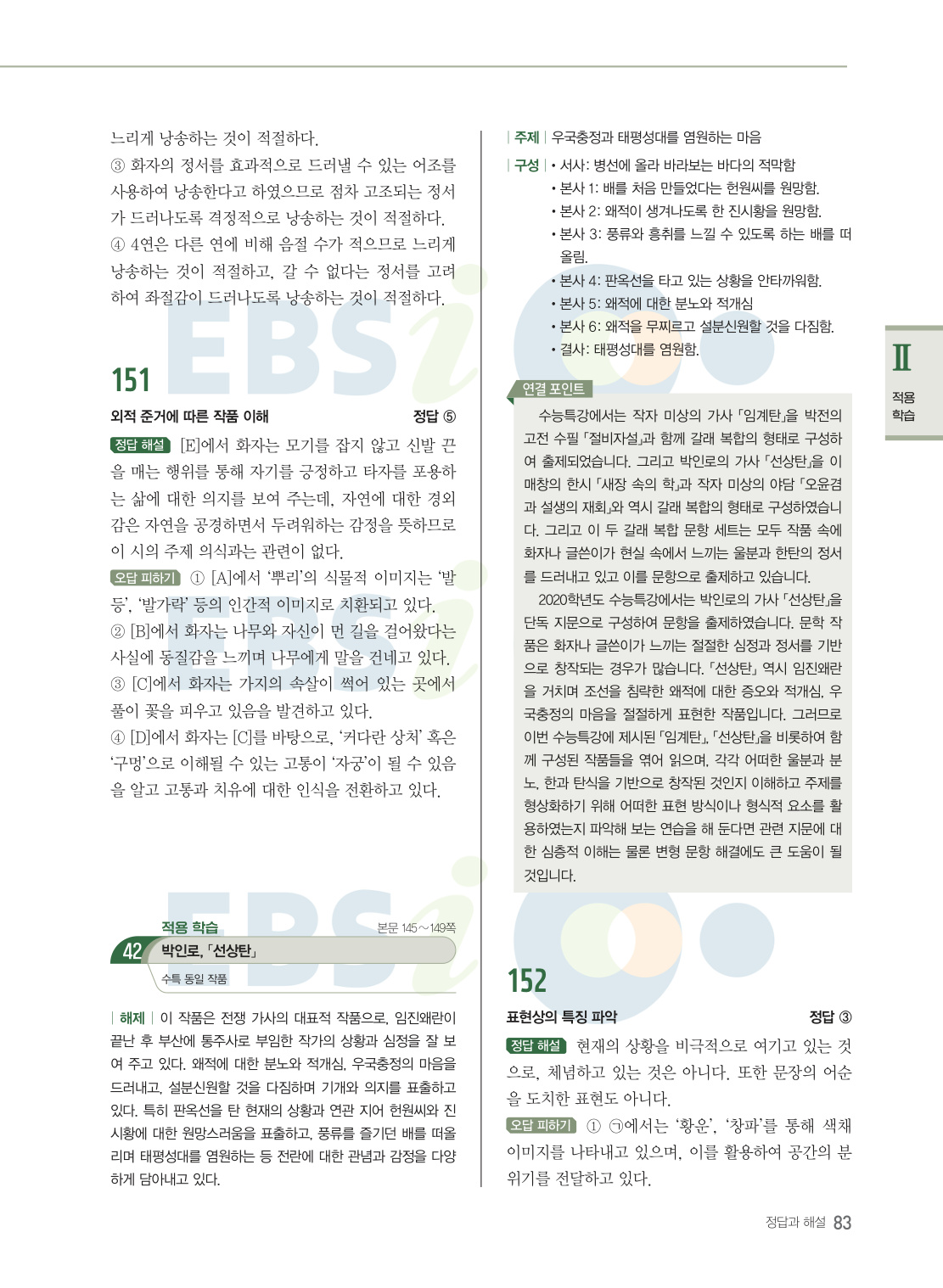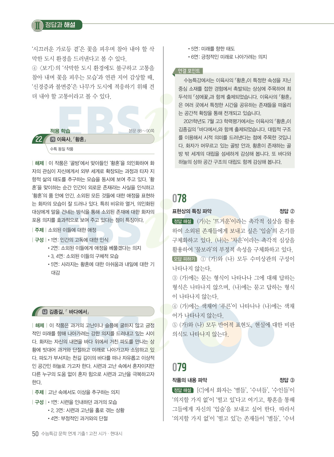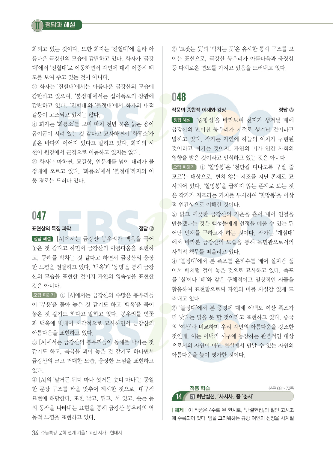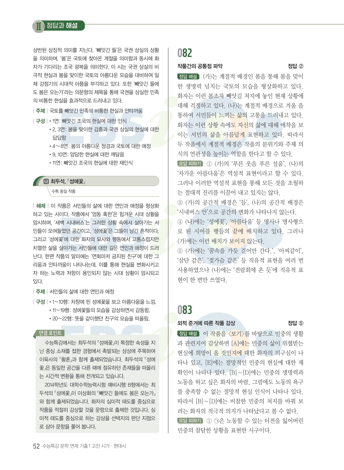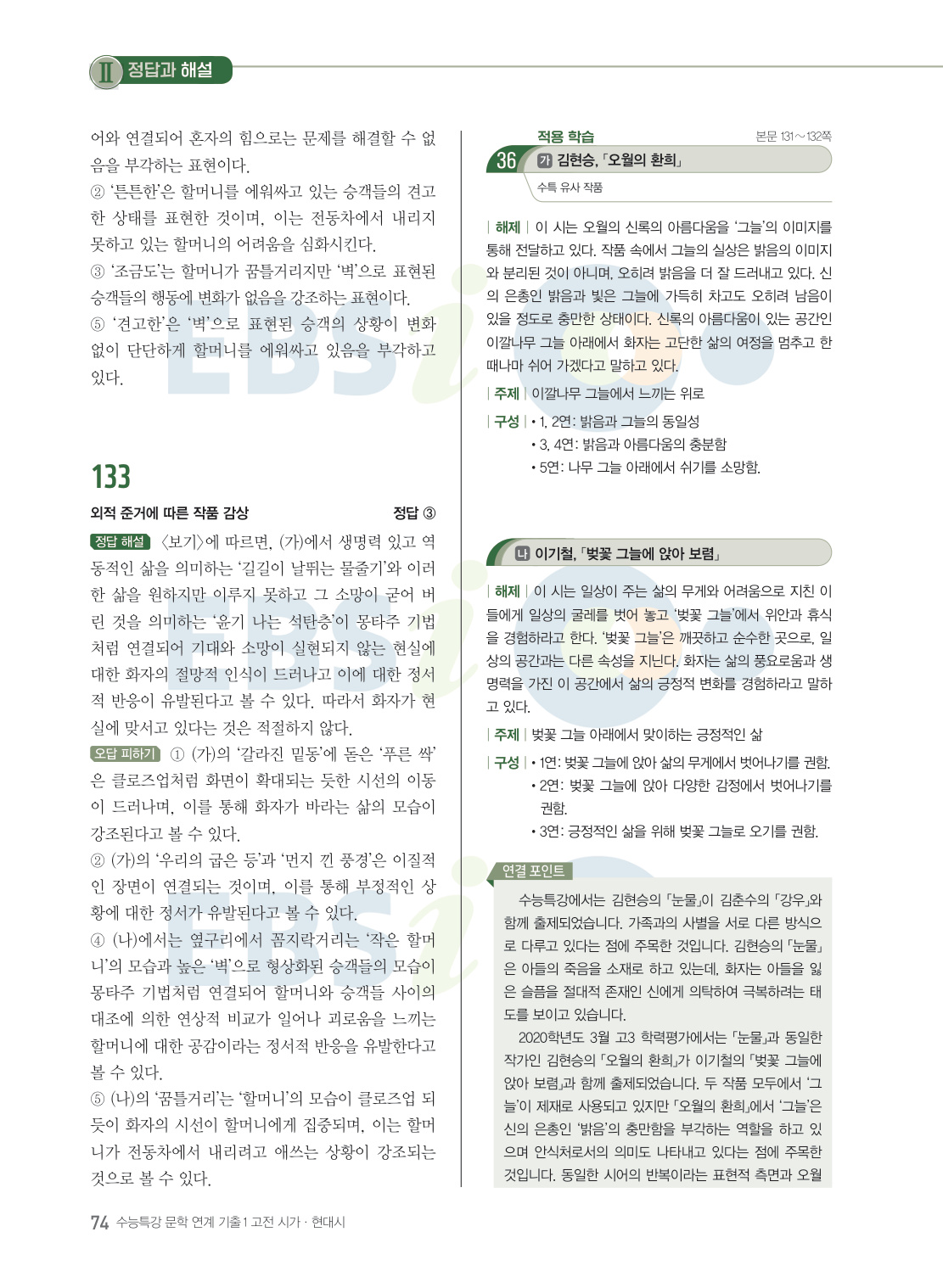 『수능특강 문학』에 수록된 지문과 연관성이 있는 기출 문항을 풀어 봄으로써 연계교재에서 출제되지 않은 나머지 문항도 대비 가능한 교재다. 『수능특강 연계 기출 문학작품 연계 기출1 고전시가·현대시』는 수능특강 수록 작품과 수록 작가의 또 다른 작품을 다른 기출문제를 수록하였다. 신뢰도 있는 기출 문항을 수록하여 연계와 비연계를 동시에 대비할 수 있다.