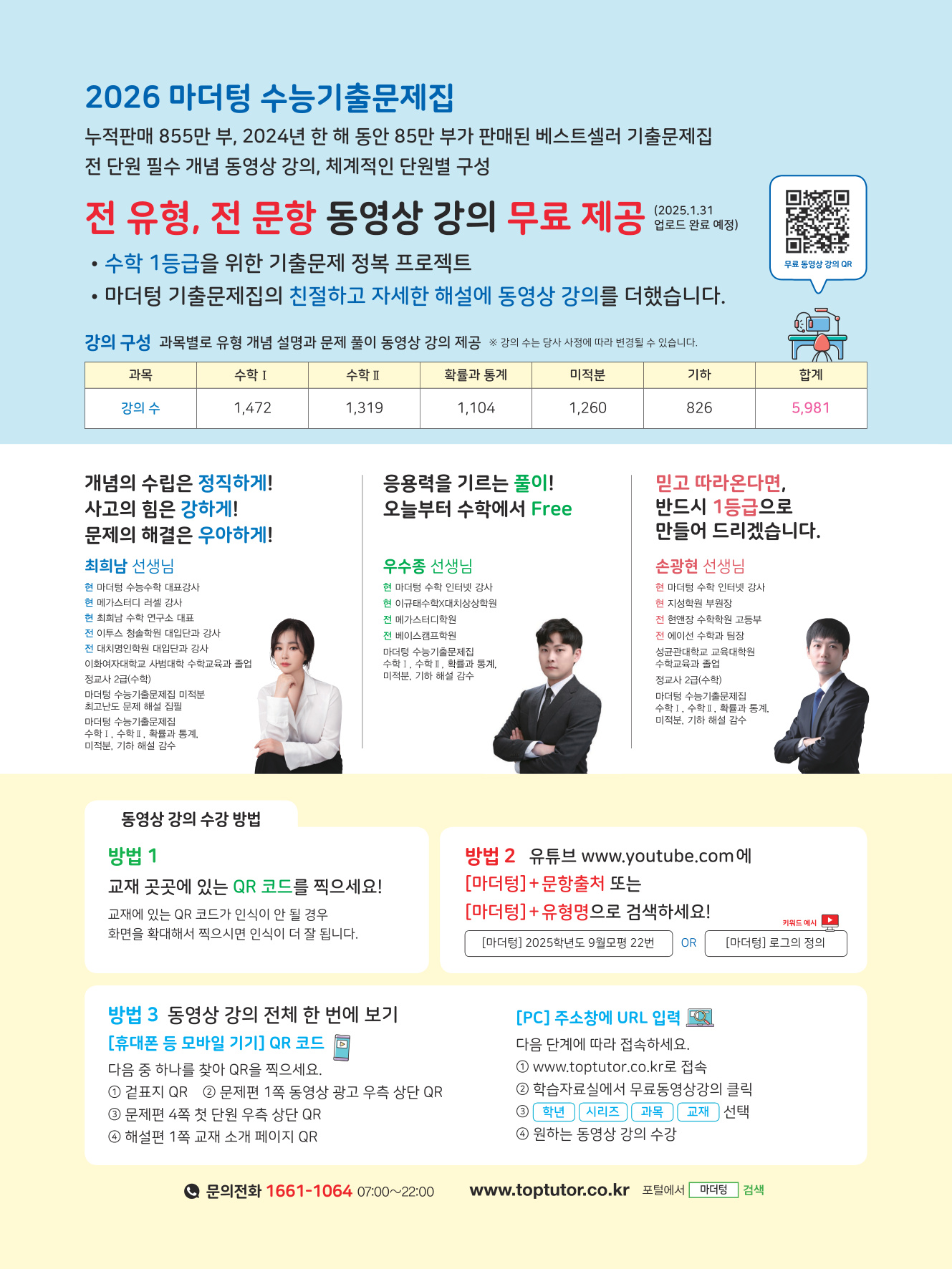 전 유형 개념 설명, 전 문항 문제 풀이 동영상 강의 무료 제공