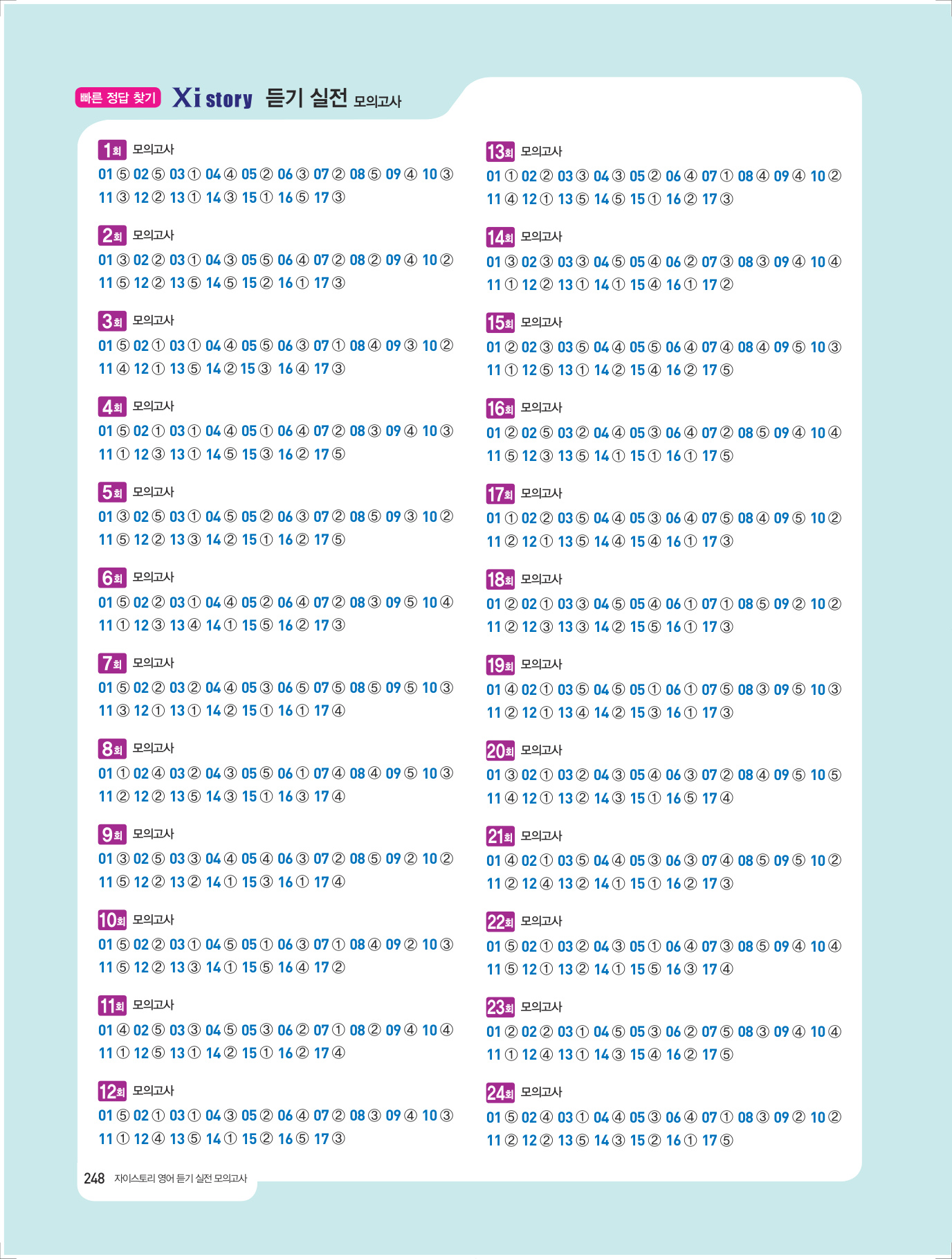 2024~2018년 고3 학력평가, 평가원, 수능 듣기 17문항을 실제 모의고사와 동일하게 수록하였습니다. 전국연합학력평가 진도에 맞춰 학습할 수 있도록 3, 4, 6, 7, 9, 10, 11월 순으로 월별로 묶어 수록하였습니다. 최신 출제 경향에 맞추어 짧은 응답 유형이 긴 응답 유형의 앞부분에 오도록 문항 순서를 수정하였습니다.