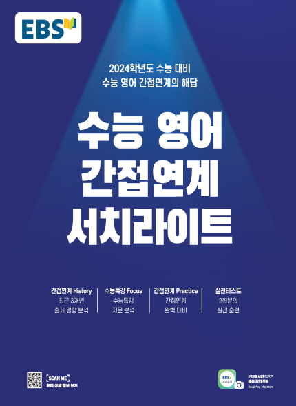 『수능 영어 간접연계 서치라이트』는 2024학년도 대학수학능력시험 영어의 간접연계에 대비하기 위한 교재로, 2024학년도 수능 대비 『수능특강 영어』와 『수능특강 영어독해연습』 중 핵심 문항을 엄선하여 해당 문항의 핵심 내용과 유사 또는 반대되거나 개념이 확장된 지문을 개발하여 최근 수능 출제 경향에 맞는 문제 형태로 수록하였다. 이를 통해 간접연계에 적응력을 기르고, 유사한 지문을 많이 읽어 본 경험과 연상 효과를 통해 수능에 적극적으로 대비할 수 있도록 하였다.