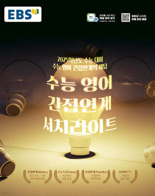 『EBS 수능 영어 간접연계 서치라이트』『수능 영어 간접연계 서치라이트』는 2025학년도 대학수학능력시험 영어의 간접연계에 대비하기 위한 교재로, 2025학년도 수능 대비 『수능특강 영어』와 『수능특강 영어독해연습』 중 핵심 문항을 엄선하여 해당 문항의 핵심 내용과 유사 또는 반대되거나 개념이 확장된 지문을 개발하여 최근 수능 출제 경향에 맞는 문제 형태로 수록하였다. 이를 통해 간접연계에 적응력을 기르고, 유사한 지문을 많이 읽어 본 경험과 연상 효과를 통해 수능에 적극적으로 대비할 수 있도록 하였다.